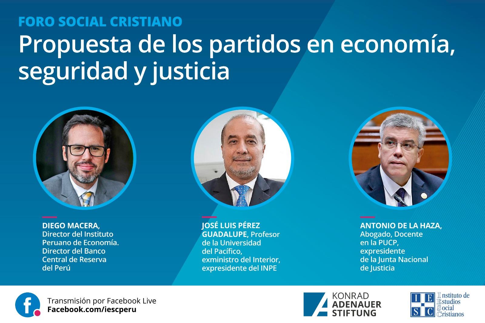 El próximo 16 de marzo la Fundación Konrad Adenauer (KAS) Perú y el Instituto de Estudios Social Cristiano (IESC) realizarán el foro presencial “Propuesta de los partidos en economía, seguridad y justicia”, un espacio de análisis y de diálogo que permitan comprender y debatir las propuestas de los partidos políticos en temas clave para el desarrollo del Perú.