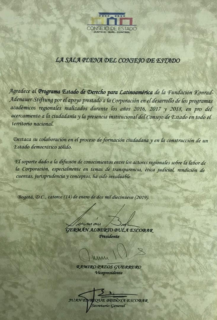 El lunes 28 de enero de 2019 la sala plena del Consejo de Estado agradeció al Programa Estado de Derecho para Latinoamérica de la Fundación Konrad Adenauer por el apoyo prestado a la Corporación del Consejo de Estado en el desarrollo de los programas y actividades regionales realizados entre 2016 y 2018, otorgándole una mención de honor en pro del acercamiento a la ciudadanía y la presencia institucional del Consejo de Estado en todo el territorio nacional.