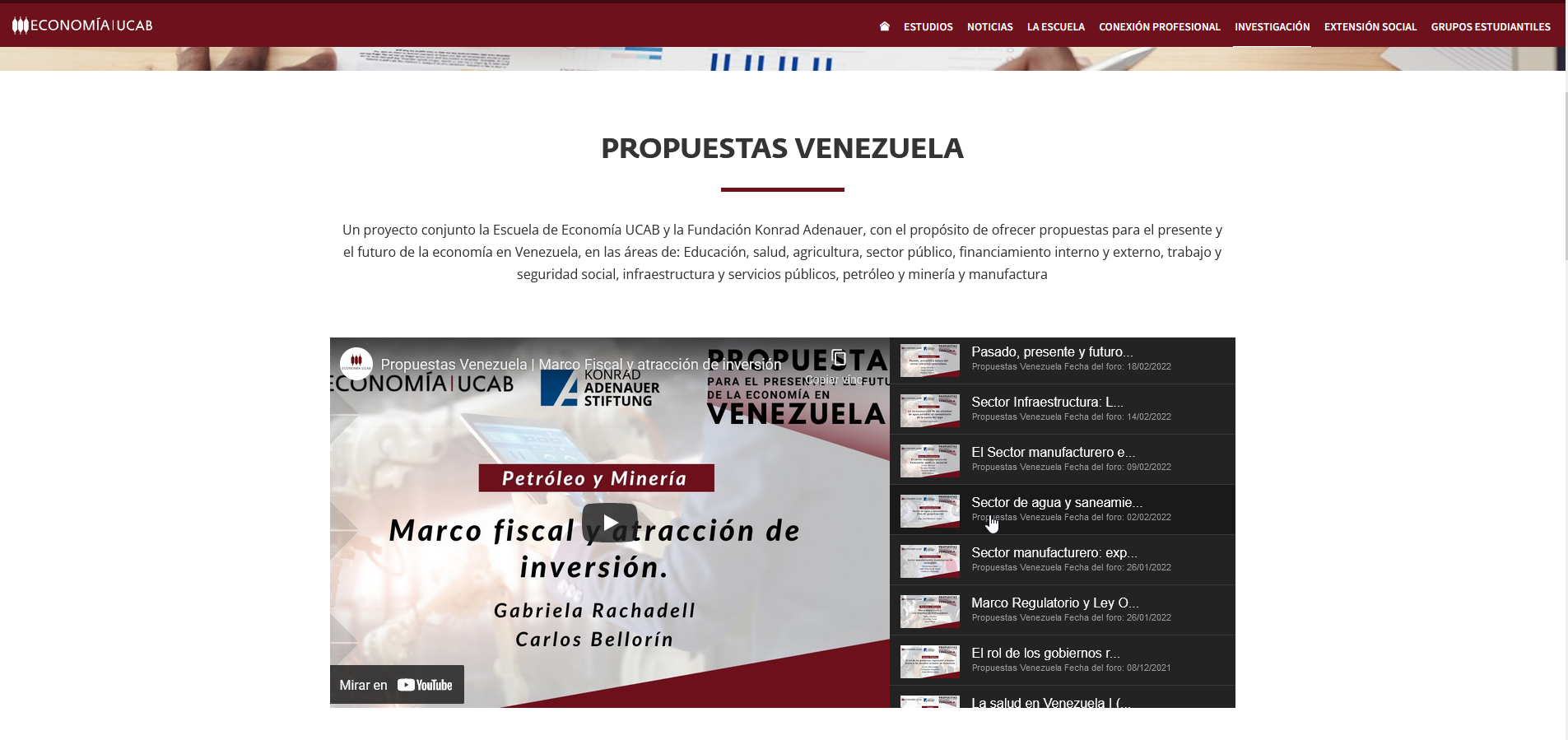 Este es un proyecto a cargo de la Escuela de Economía UCAB y la Fundación Konrad Adenauer, quienes buscan propuestas para el presente y el futuro de la economía en Venezuela. El proyecto pretende desarrollar propuestas en el ámbito de agricultura, educación, financiamiento interno y externo, infraestructura y servicios públicos, manufactura, minería, petróleo, salud, sector público, seguridad social y trabajo. Esta vez, fiel a la tradición petrolera venezolana los expertos, ahondaron en temas neurálgicos para el país y su desarrollo.