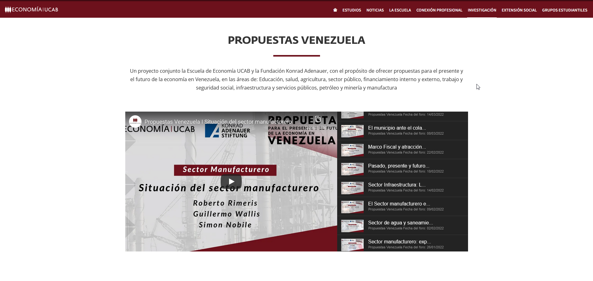 Este es un proyecto a cargo de la Escuela de Economía UCAB y la Fundación Konrad Adenauer, quienes buscan propuestas para el presente y el futuro de la economía en Venezuela. El proyecto pretende desarrollar propuestas en el ámbito de agricultura, educación, financiamiento interno y externo, infraestructura y servicios públicos, manufactura, minería, petróleo, salud, sector público, seguridad social y trabajo.