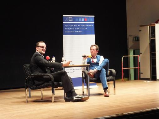 (Autor: Ivo Lovric) Der Bundestagsabgeordnete Jens Spahn, geschäftsführender parlamentarischer Staatssekretär und ehemaliger gesundheitspolitischer Sprecher der CDU/CSU-Bundestagsfraktion, trat gemeinsam mit dem Arzt, Moderator, Kabarettist und Zauberkünstler Dr. Med. Eckart von Hirschhausen auf.