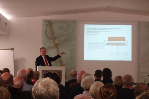Dr. Harald Rubner hatte sich in seinem Vortrag auf die Gründe und Wirkungen des niedrigen Ölpreis auf die Weltwirtschaft konzentriert. Die Grenzen des Wachstums sind schon vom Club of Rome definiert worden. Global gesehen gibt es Ungleichgewichte in der Produktion und im Verbrauch von Öl. Dieser Rohstoff ist kein knappes Gut, vielmehr steigen die bekannten Reserven, die gefördert werden können. Es gibt ein hohes Angebot bei gesunkenen Produktionskosten. Zudem wächst die Nachfrage langsamer und wird sinken, da die Produktion von Elektroautos bis 2025/2030 ausgeweitet wird. Zudem gibt ein großes Potenzial an Substitutionseffekten, die sich auf die Verteilung des Wohlstandes auswirken.