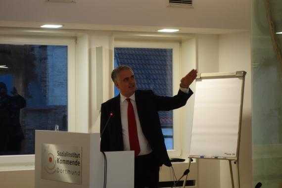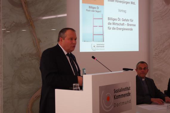 Josef Hovenjürgen, MdL ging auf die Auswirkungen des niedrigen Ölpreises auf die Verbraucher und einige Staaten ein. So profitiert beispielsweise Indien davon, dass die Investititionskosten sinken, die sich auf die Inflation und eine ausgleichende Handelsbilanz auswirken. In Deutschland wird derzeit die Binnennachfrage gestärkt, der Verkauf von Ölheizungen steigt wieder. Dadurch ist die Energiewende schwieriger umsetzbar. Die Anreize für Energieeffizienz werden geringer.