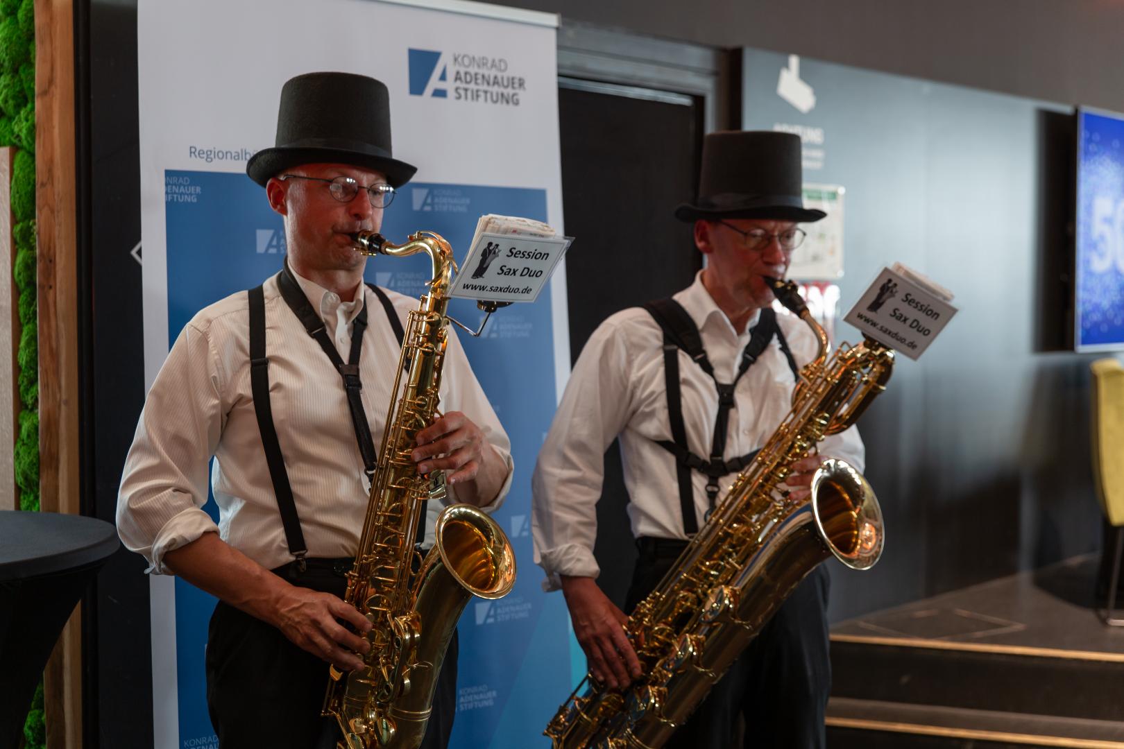 Nach musikalischer Einstimmung durch das Session Sax Duo (Rheda-Wiedenbrück) und einem Get together gab das Regionalbüro Westfalen mit einem Film einen Einblick in die vielfältige Arbeit der letzten 50 Jahre sowie in aktuelle Projekte. Dr. Ulrike Hospes (Landesbeauftragte für Nordrhein-Westfalen und Leiterin des Politischen Bildungsforums NRW) erinnerte an die politischen Herausforderungen im Jahr 1972 sowie an die Entwicklung der Politischen Bildung im Münsterland, in Ostwestfalen-Lippe, dem Sauerland sowie in weiten Teilen des Ruhrgebiets.