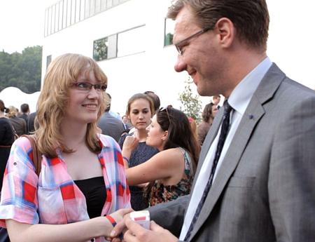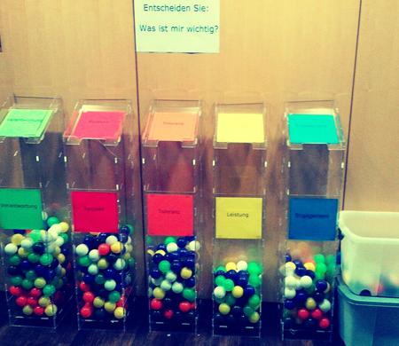 Als ich mich erholt hatte, ging ich in den Garten, wo ein junges Jazzquartett aus Frankfurt spielte. Bei der großen Auswahl des Caterings konnte ich mich kaum entscheiden, doch die langen Warteschlangen an einigen Ständen bewegten mich dazu, mir erst einmal die Ausstellung über die Jugend im ersten Obergeschoss anzusehen. Diese war sehr originell, besonders die 5 Urnen: Verantwortung, Respekt, Toleranz, Leistung und Engagement, welche mit bunten Bällen gefüllt waren, je nach dem für welchen Begriff man sich entschied, sprachen mich an.
