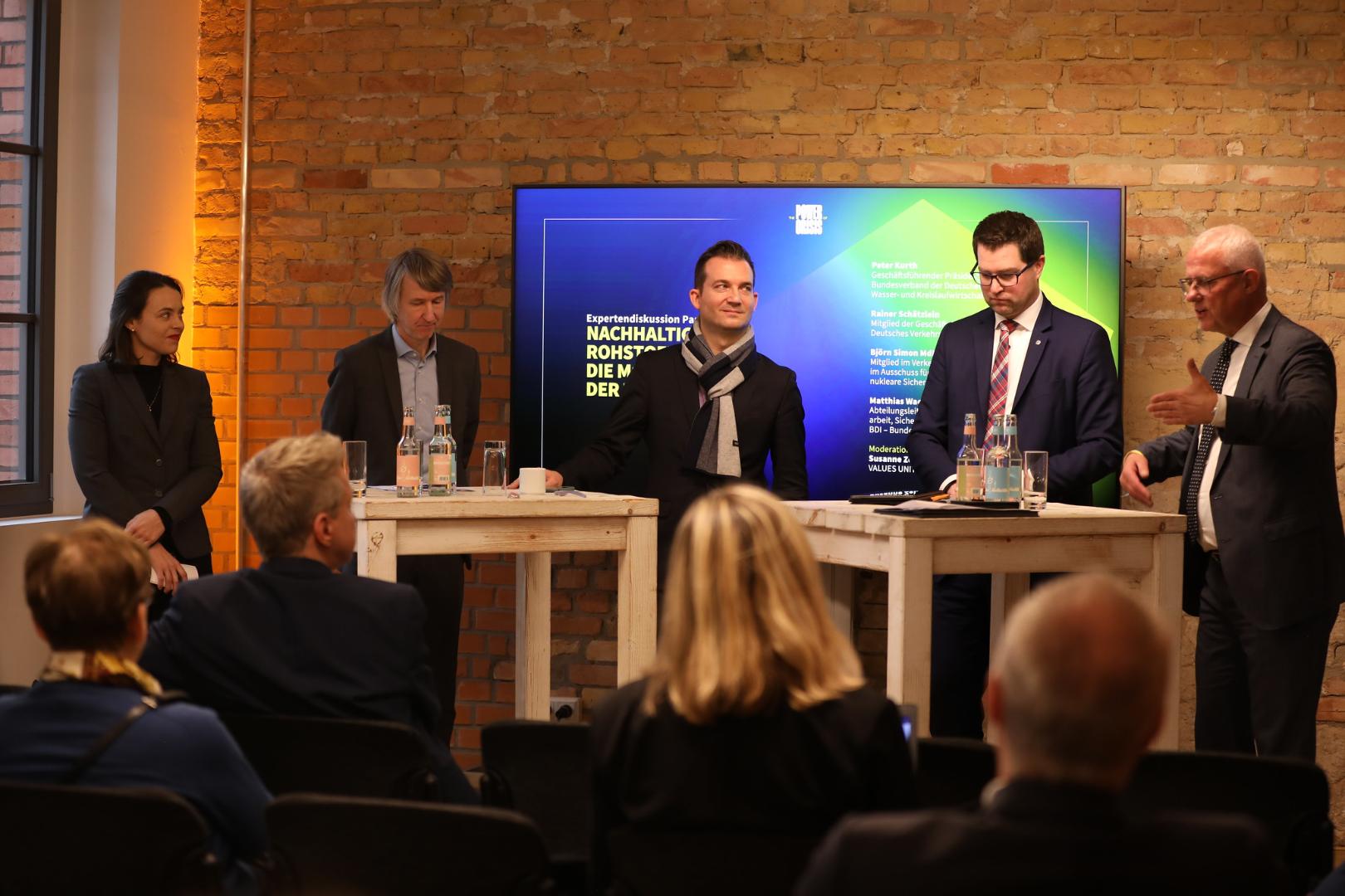 In der Diskussionsrunde zu nachhaltigen Rohstoffen für die Mobilität der Zukunft wies der Präsident des Bundesverbands der Deutschen Entsorgungs-, Wasser-, und Kreislaufwirtschaft Peter Kurth eingangs darauf hin, dass die Debatte um die Mobilität der Zukunft ohne Rohstoffdenken nicht möglich sei. Der Rohstoffbedarf bei Metallen würde sich verdoppeln und die meisten Metalle kämen aus Ländern, mit denen wir in keine einseitige Abhängigkeit geraten sollten. Recycling sei deswegen eine wichtige Rohstoffquelle, nur gebe es beispielsweise bei Batterien noch zu wenig wirtschaftliche Anreize, diese so zu bauen, dass sie gut recycelbar sind. Kurth plädierte für ein Umdenken beim Bau von Batterien und anderen Elektrobauteilen, das die stoffliche Trennung und Wiederverwertung stärker mitdenke und formulierte den eindrücklichen Satz: „Was der Mensch zusammenbringt, muss der Mensch auch wieder trennen können!“. Der Bundestagsabgeordnete Björn Simon, Mitglied in den Ausschüssen für Verkehr sowie für Umwelt, Naturschutz, nukleare Sicherheit und Verbraucherschutz, ergänzte, dass die Kreislaufwirtschaft auch im Mobilitätsbereich weiter vorangebracht werden müsse, um den Bedarf an Primärrohstoffen so gering wie möglich zu halten. Neben dem mechanischen Recycling habe auch das chemische Recycling großes Potenzial, was allerdings zwischen der Unionsfraktion und der Regierungskoalition mit Blick auf Umwelteinflüsse ein noch nicht geklärter Streitpunkt sei. Zudem wies Simon auf die Bedeutung erneuerbarer Energiequellen für synthetische Kraftstoffe hin, die beispielsweise in der Luftfahrt eine entscheidende Rolle für eine klimaverträgliche Mobilität spielen könnten. Matthias Wachter, Abteilungsleiter Internationale Zusammenarbeit, Sicherheit, Rohstoffe und Raumfahrt beim Bundesverband der Deutschen Industrie, betonte in seinem Beitrag die Notwendigkeit, eine kohärente Rohstoffpolitik ohne ein Silodenken in einzelnen Ressorts zu verfolgen und Abhängigkeiten insbesondere von China – so gut es gehe – zu reduzieren. Sinnbildlich für das bisherige Vorgehen Deutschlands sei für ihn die neue Afrika-Strategie des BMZ, in der das Thema Rohstoffe kaum eine Rolle spiele. Auch beim Thema Kreislaufwirtschaft drängte Wachter auf ein schnelles Handeln. Die Kreislaufwirtschaft im Bereich von Elektrofahrzeugen müsse jetzt anlaufen, damit in ein paar Jahren, wenn die hohen Verkaufszahlen bei Elektroautos von heute sich beim Recycling niederschlagen werden, ein System etabliert sei, das die großen Potenziale bei der Wiederverwertung auch stemmen könne. Rainer Schätzlein vom Deutschen Verkehrsforum betonte, dass die Verkehrswende von der Energiewende abhängig sei. Strom aus klimaneutralen Quellen sei für die Mobilität von morgen ebenso ein notwendiger Rohstoff wie die bereits diskutierten Metalle, da er den bisherigen Rohstoff aus fossilen Quellen – den Kraftstoff – ersetzen solle. Dazu sei ein massiver und schneller Ausbau nicht nur der Quellen erneuerbarer Energie, sondern auch der Netze und der Infrastruktur für Schnellladepunkte notwendig, insbesondere, wenn ab 2024 wie geplant die ersten serienreifen LKW mit batterieelektrischem Antrieb auf die Straßen kommen sollten. Zudem dürfe nicht aus dem Blick verloren werden, dass Wasserstoff nicht nur für die Industrie, sondern auch für die Produktion klimaneutraler Kraftstoffe im Verkehrssektor, insbesondere für die Luft- und Schifffahrt, von großer Bedeutung sei.