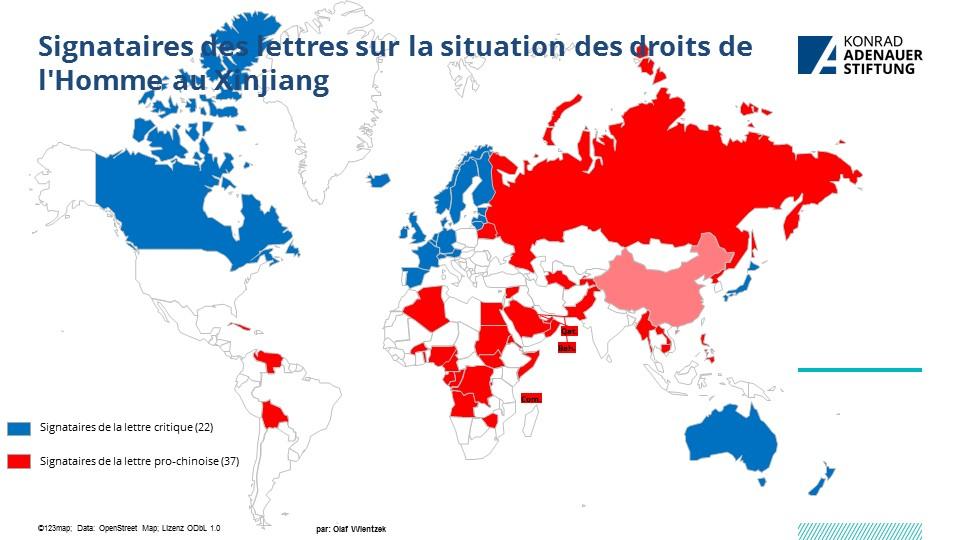 A remarquer tout particulièrement : la confronta-tion sur la situation dans la province chinoise du Xinjiang. Ainsi, le 10 juillet, 22 états ont exprimés, dans une démarche inhabituelle, par le biais d’une lettre à la commissaire pour les droits de l’homme de l’ONU, Michèle Bachelet, sur la situa-tion des droits de l’homme dans la province du Xinjiang spécialement au sujet des emprisonne-ments en masse et le traitement des musulmans Ouïgours (2). Parmi les signataires, il y avait 15 des 28 pays de l’UE dont l’Allemagne, la France et la Grande Bretagne (carte 1) de même qu’entre autres le Canada, le Japon l’Australie et la Suisse. La Chine a vivement rejeté ce reproche. Seule-ment deux jours plus tard a suivi dans la foulée une lettre signée par 37 pays qui vantait expres-sément les progrès du régime chinois sur sa fa-çon de procéder avec les Ouïgours. La lettre est signée entre autres par la Russie, l’Algérie, l’Arabie Saoudite, la Corée du Nord, Cuba et le Soudan. Ce qui est frappant :