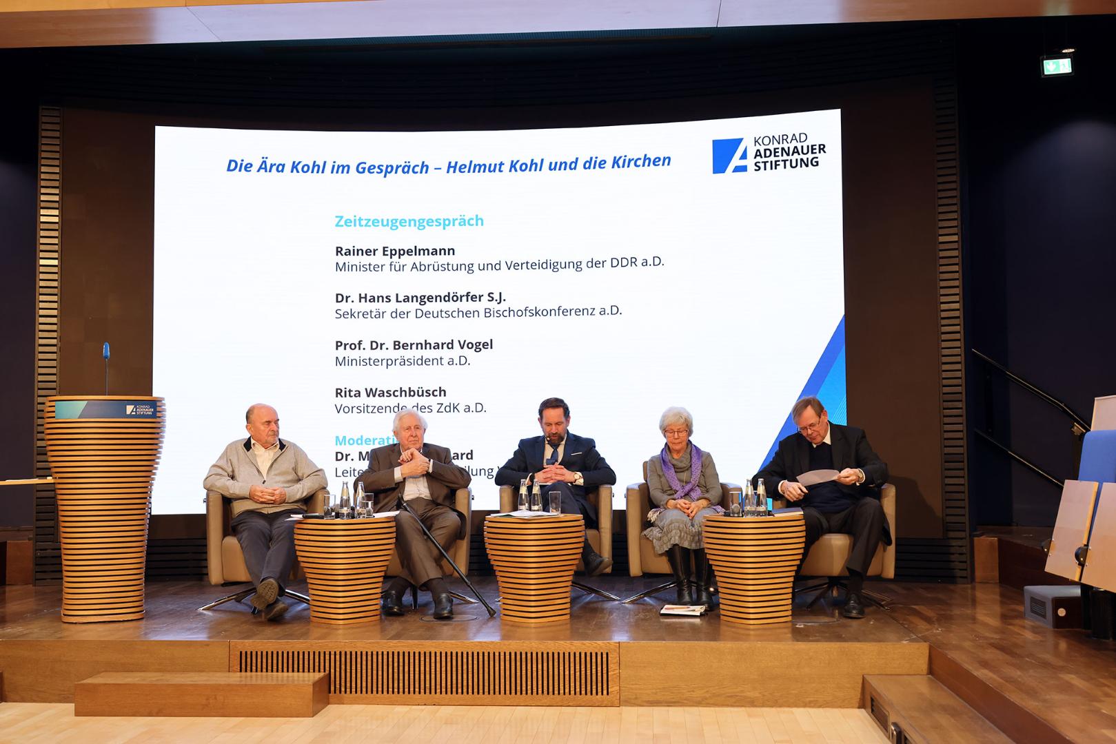 Im abschließenden, von Michael Borchard moderierten Zeitzeugengespräch zwischen der ehemaligen Präsidentin des Zentralkomitees der deutschen Katholiken, Rita Waschbüsch, dem Mitgründer des „Demokratischen Aufbruchs“ und ehemaligen Minister für – wie dieser ausdrücklich betonte – Abrüstung und Verteidigung der DDR sowie langjährigen CDA-Vorsitzenden, Rainer Eppelmann, dem langjährigen Sekretär der Deutschen Bischofskonferenz, Dr. Hans Langendörfer SJ, und dem Ehrenvorsitzenden der Konrad Adenauer Stiftung, Prof. Dr. Bernhard Vogel, wurde nochmals betont, dass ein aus dem christlichen Glauben resultierendes Verantwortungsgefühl eine Motivation für Helmut Kohl gewesen sei, sich in der Politik und in der CDU zu engagieren. Sein bisweilen ostentativ betonter Katholizismus sei authentisch gewesen. Frau Waschbüsch unterstrich die angesprochene Konfliktbereitschaft Kohls gegenüber der Amtskirche durch den Hinweis, dass dieser nach dem Ausstieg der katholischen Kirche aus der Schwangerschaftskonfliktberatung von Anfang an den von ihr und Bernhard Vogel mitgegründeten Verein Donum Vitae unterstützt habe. Pater Langendörfer wie auch Bernhard Vogel betonten, dass Kohl zum Mainzer Kardinal Lehmann ein sehr gutes, wenn auch von Spannungen nicht freies Verhältnis gehabt habe. Beim Kölner Erzbischof Joachim Kardinal Meisner habe es sich dagegen um ein „Nichtverhältnis“ gehandelt.