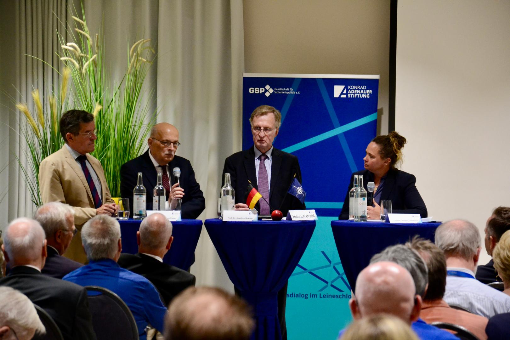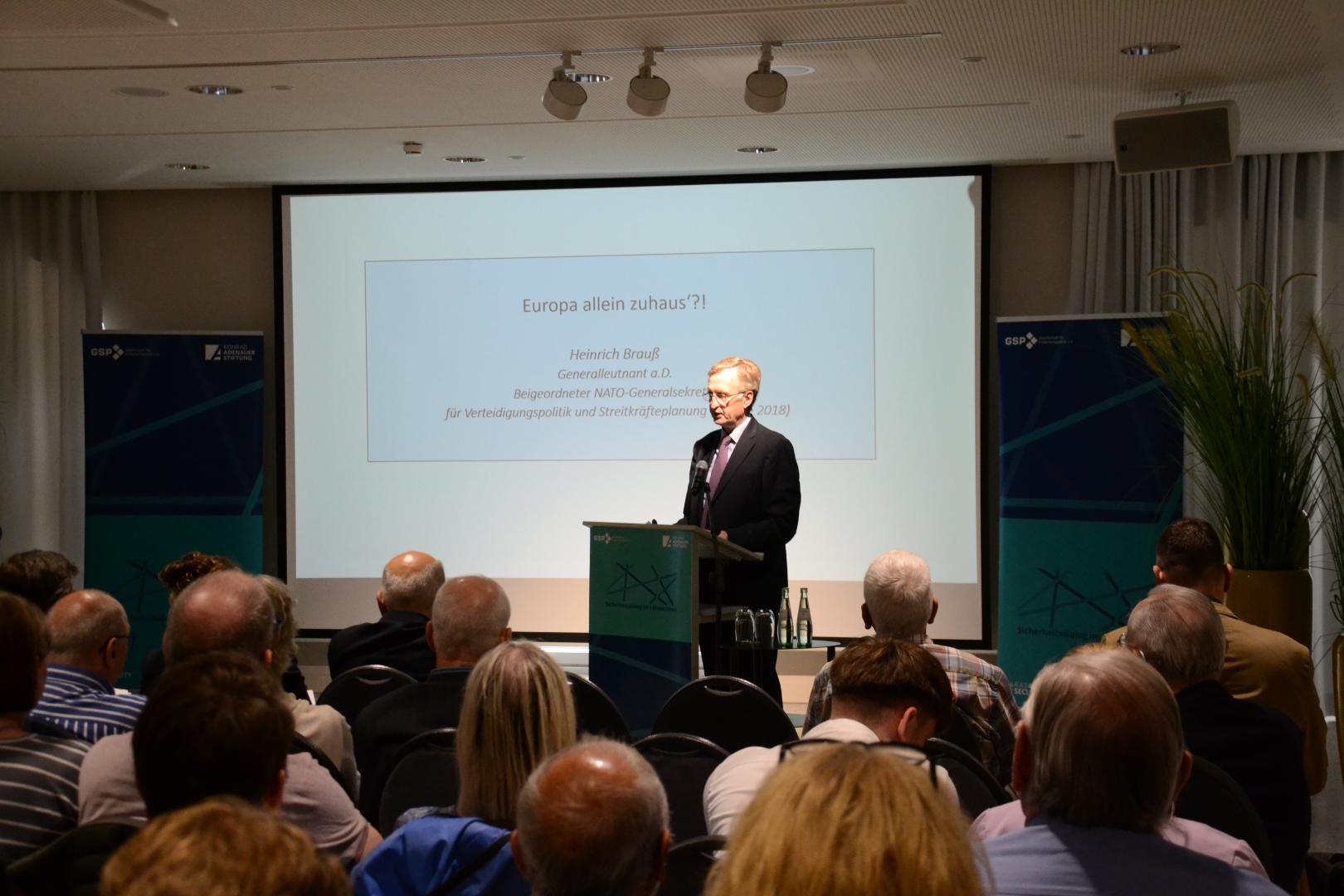 Generalleutnant Heinrich Brauß ging zunächst auf den seiner Meinung nach sehr merkwürdigen NATO-Gipfel ein. Zur Entlastung der USA wird die Lastenverteilung im Bündnis so geändert, dass die europäischen Mitglieder einen faireren Anteil zu tragen haben, allerdings mit einem zeitlich sehr gestreckten Horizont bis 2035. In der sehr Abschlusserklärung werden die klassischen NATO-Prinzipien, wie die unverbrüchliche Solidarität, bekräftigt, sodass weiterhin mit dem US-Beistand gerechnet werden kann. Allerdings in einem Scenario, indem gleichzeitig Russland die NATO auf Spitzbergen oder in Narwa/Estland testet und China Taiwan angreift, würden sich die Amerikaner auf den Indopazifik fokussieren und nur wenig Hilfe für Europa bereitstellen. Auch können Provokationen Russlands an der Suwalkibrücke bereits vor 2029 nicht ausgeschlossen werden. Die Ukraine muss weiter unterstützt werden, schon allein, weil die Ukraine aus geographischen Gründen Teil der europäischen Verteidigung ist. Die neuen Fähigkeitsziele der NATO erfordern eine Verstärkung der Luftverteidigung um 400 %. Deutschland hatte mal 58 Patriot Systeme, gegenwärtig nur noch 9, was völlig unzureichend ist. Frankreich und Großbritannien können die USA nuklear nicht ersetzen, ebenso wie das Aufklärungs- und Transportpotential der USA durch Europa in absehbarer Zeit nicht kompensiert werden kann. Abschließend vertrat General Brauß die Meinung, dass die Wehrpflicht reaktiviert werden müsse und das schwedische Modell wahrscheinlich nicht ausreichen werde.