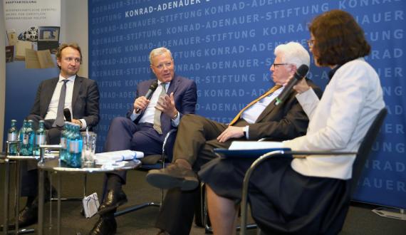 Auch deswegen gab es zu seinen Ehren ein wissenschaftliches Symposium: Professor Andreas Rödder referierte über deutsche Geschichte und Identität sowie die Wahrnehmung Deutschlands im In- und Ausland – und verwies dabei immer wieder auf die wissenschaftliche Arbeit von Hans-Peter Schwarz. Und im Anschluss diskutierten der Journalist und Leiter der Parlamentsredaktion der F.A.Z., Eckart Lohse, der Vorsitzende des Auswärtigen Ausschusses des Bundestags, Norbert Röttgen, und der Politikwissenschaftler Professor Heinrich Oberreuter mit der Journalistin Jaqueline Boysen, durchaus sehr kritisch, über „Die neue Völkerwanderung nach Europa“, die letzte Monografie von Hans-Peter Schwarz.