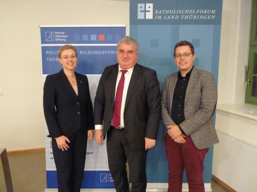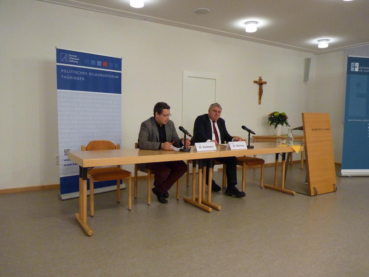 Am 03.11.106 fand gegen 19:00 in der Katholischen Bildungsstätte St. Martin in Erfurt eine Veranstaltung zu dem Thema „Menschenrecht Religionsfreiheit - Zur Lage der Christen in Syrien und Irak“. Geladener Referent war Dr. Otmar Oehring, Koordinator Internationaler Religionsdialog im Team Politikdialog und Analyse der Konrad-Adenauer-Stiftung. Die Moderation des im Anschluss zum Vortrag geplanten Gesprächs übernahm Dr. Claudio Kullmann, Leiter des Katholischen Forums im Bistum Erfurt. Nach einem kurzen Grußwort von Maja Eib, Leiterin des Politischen Bildungsforums Thüringen der Konrad- Adenauer- Stiftung begann Dr. Oehring seinen Vortrag, in dem er nicht nur auf die generelle Lage der Christen im Irak und in Syrien einging, sondern ebenfalls seine Eindrücke seiner erst vor kurzem zurückliegenden Reise in den Nordirak schilderte.