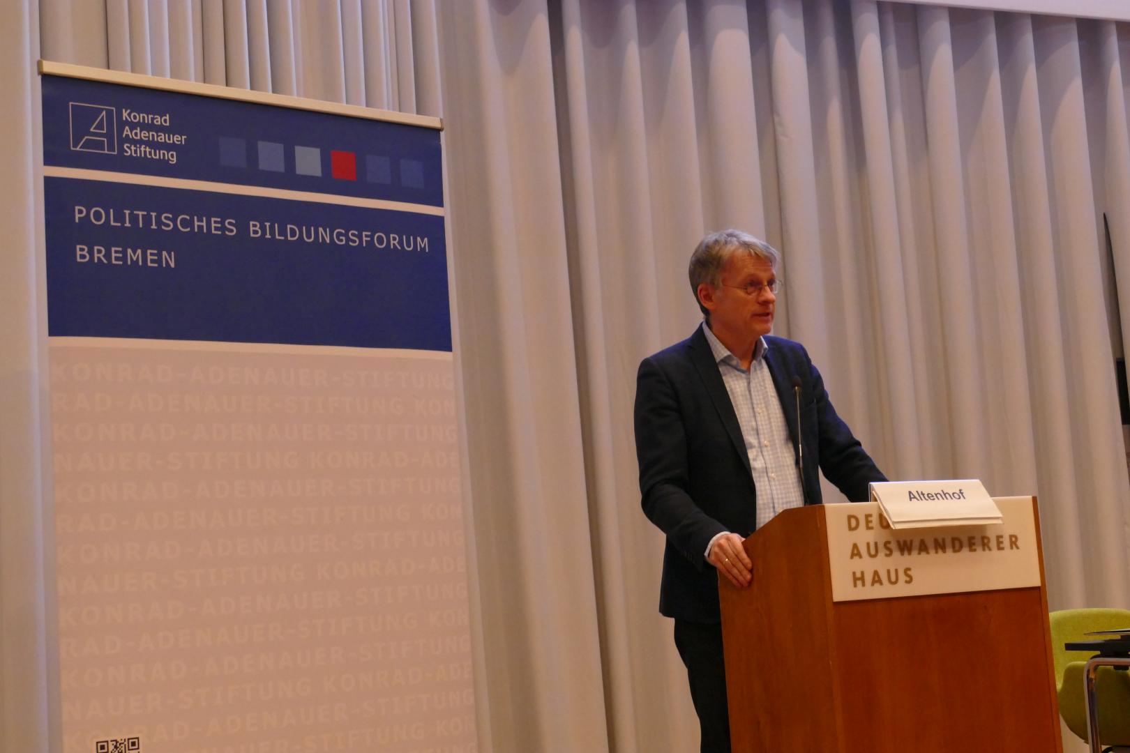 Ralf Altenhof begrüßte das Publikum und führte es in das unbekannte Thema ein. Er erklärte, dass das Auswandererhaus als Veranstaltungsort bewusst gewählt wurde, da es zum Teil die Historie der deutschen Auswanderer erzählt. Auslandsdeutsche sind Personen, die ins Ausland gezogen sind, ohne ihren deutschen Pass abzulegen und sich dort mindestens sechs Monate aufhalten. Allein 2022 wanderten ungefähr 270.000 Deutsche aus. Viele davon sind jung und hoch qualifiziert. Das beliebteste Land unter den Auslandsdeutschen ist die Schweiz. Es wohnen dort über 300.000 Menschen, die eine deutsche Staatsbürgerschaft haben. Schon in der Vergangenheit besetzten Deutsch-Stämmige im Ausland hohe Posten. Ein Beispiel dafür ist der ehemalige US-amerikanische Verteidigungsminister Donald Rumsfeld. Dessen Großvater und Urgroßvater aus Weyhe, Niedersachsen, in die USA immigrierten.