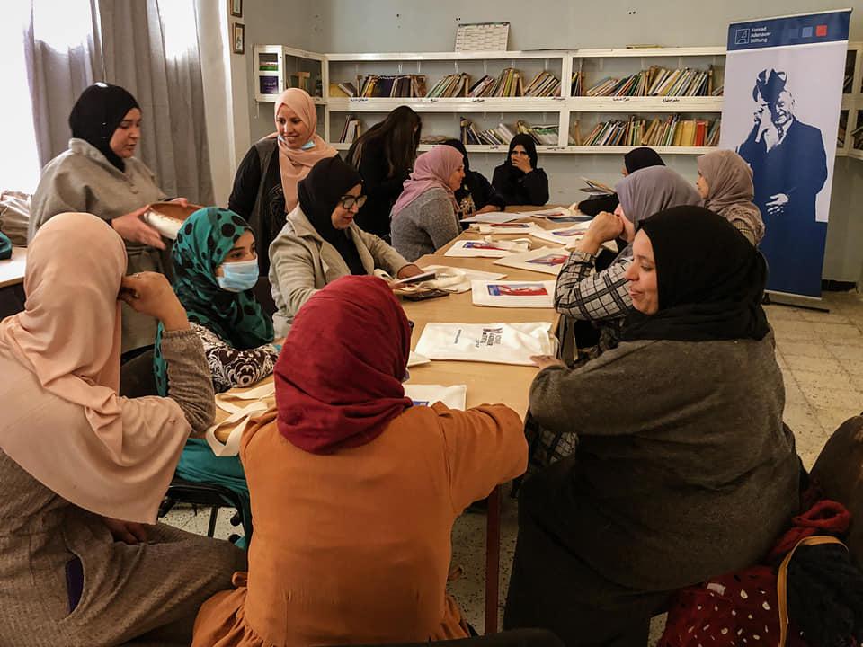 La formation qui a eu lieu les 08 et 09 mars, à l’occasion de la journée internationale des droits de la femme, sur l’autonomisation économique des femmes rurales, organisée par la Fondation Konrad Adenauer et ses partenaires, la Fondation Indjaz collectif et l’association locale Sawaidahon a permis à une vingtaine de femmes rurales marginalisées, habitant dans des zones d’ombres, de participer au programme de la session de formation . Ce programme les dote de compétences qui changeront leur vie et leur permettront d'adapter ce qu’elles ont appris à leurs besoins, de contribuer à leur autonomisation économique, d'améliorer leur sécurité alimentaire et nutritionnelle ainsi que de créer des moyens de subsistance en milieu rural.