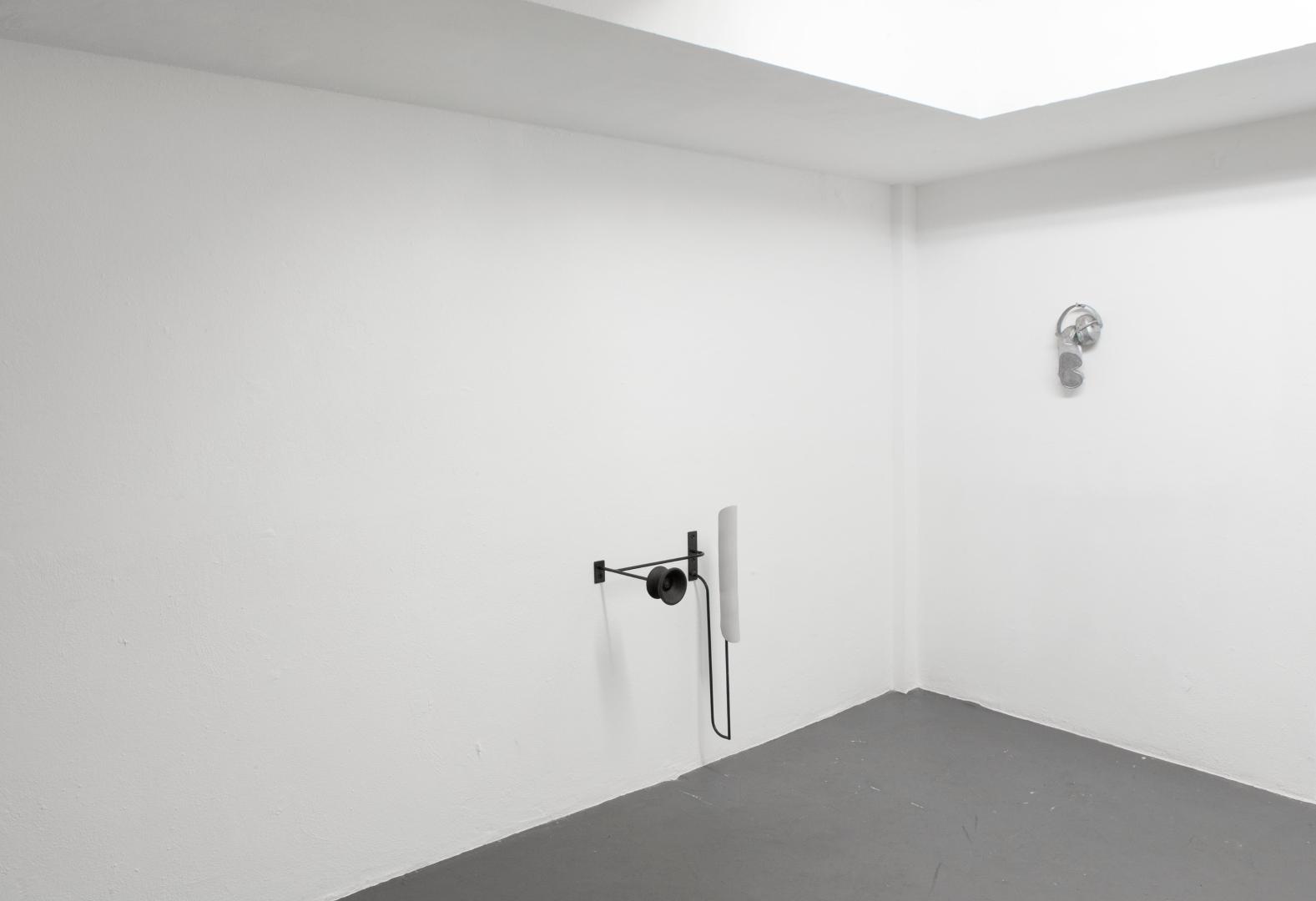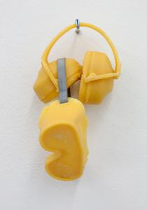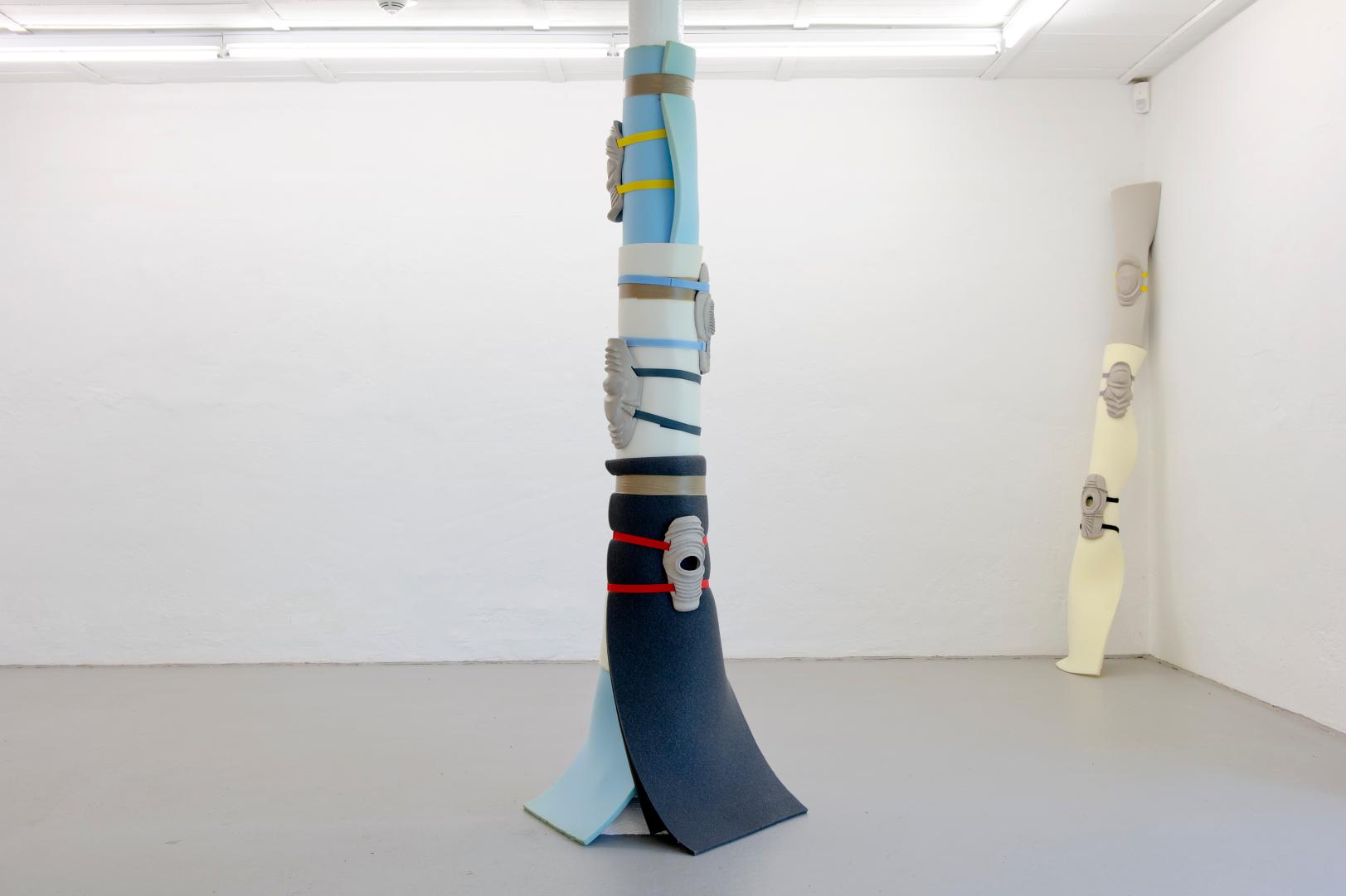 Das kommt darauf an. Flag oder Sign brauchen den Titel nicht, um verstanden zu werden, da ist durch die Form oder das Material das zitierte Objekt genügend sichtbar. Bei anderen Arbeiten helfen die Titel. Bei Protectors zum Beispiel. Das sind Objekte aus Keramik, wo ich von Körperschutz, der im Sport oder im Militär benutzt wird, ausgegangen bin. Der ursprüngliche Ausgangspunkt für diese Arbeit war mein Interesse für diese überformten Turnschuhe, die es seit einigen Jahren gibt – diese Sohlen, diese Materialschichtungen, die etwas Prothesenhaftes haben und fast schon Skulpturen an sich sind. Als Keramikobjekte verweisen Protectors aber auch in viele andere Richtungen. Oft werden sie als Masken gelesen oder, wenn sie auf dem Boden liegen, als amöbenhafte Skulpturen - je nachdem, wie sie installiert sind. Das Maskenhafte war besonders präsent, als ich die Protectors mit Klettverschluss an einer mit Schaumstoff umwickelten Säule gezeigt habe. Das sah aus wie ein sportlicher Marterpfahl. Die Gesichter an einem Totem repräsentieren Geister oder Gottheiten und haben so wiederum mit Schutz zu tun.