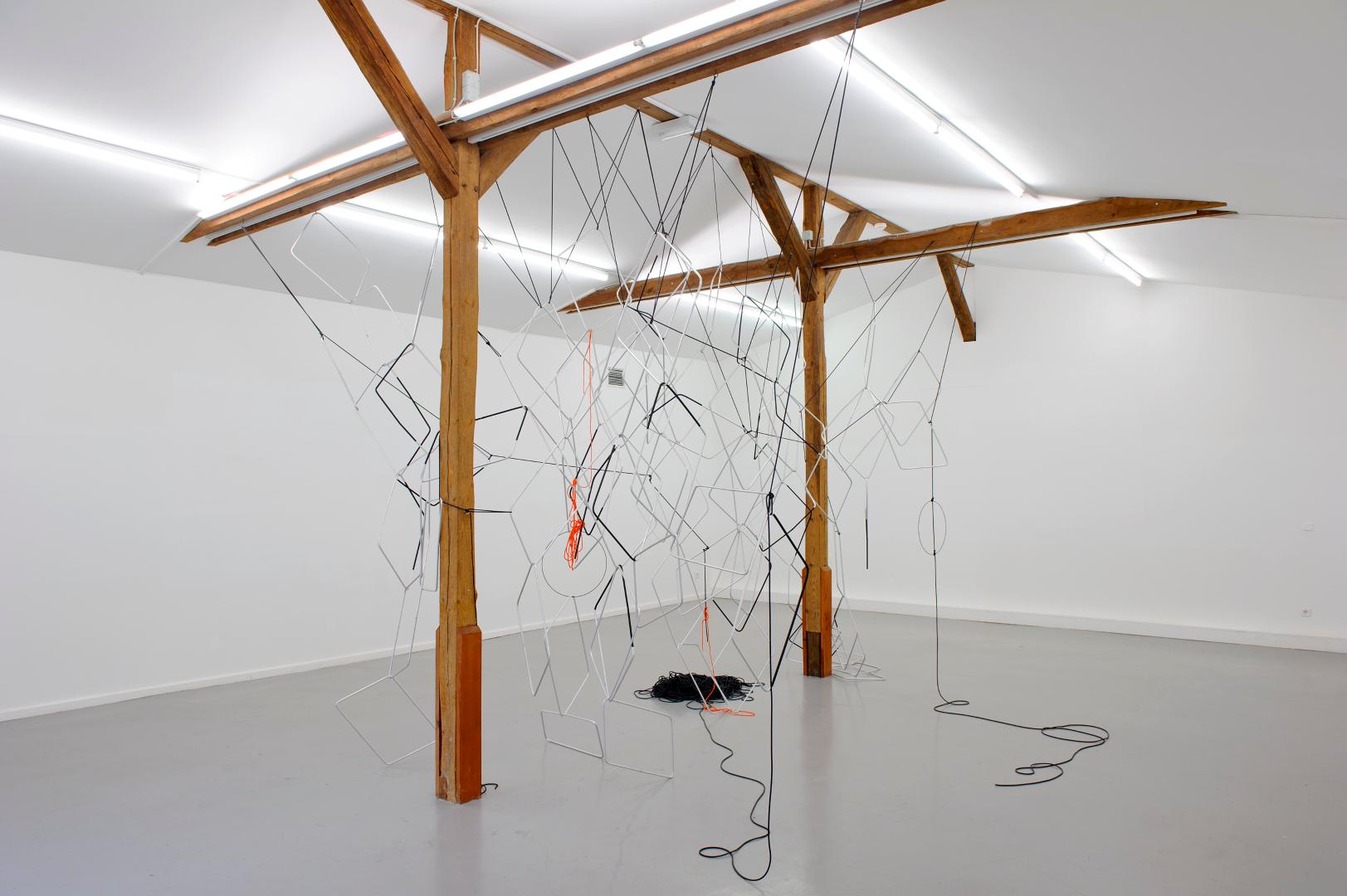 Meistens springt mich ein bestimmtes Objekt - ein Detail, ein Aspekt an ihm - an. Oder ich stelle mit der Zeit fest, dass mir Dinge immer wieder begegnen und dadurch wichtig werden. Zum Beispiel in New York gibt es überall im Stadtraum diese chain link Zäune, Zäune aus Maschendraht. Die sind nicht besonders schön, eher lieblos, sie zäunen Basketballfelder an Straßenecken ein oder Schulhöfe. Dabei sind sie manchmal eingedellt oder ausgefranst. Sie waren der Ausgangspunkt für meine Arbeit Fences, die aus einzelnen Elementen besteht, die wie Kettenglieder nicht linear oder geordnet ineinander greifen, sondern im Raum verspannt sind. Die Fences sind keine Grenze mehr, sondern Objekte und greifen das fehlerhafte Moment der Zäune als das zentrale auf. Ein anderes Beispiel sind die Railings: als ich das letzte Mal in New York war, passierte gerade Occupy Wallstreet. Unmengen von Menschen wurden von mobilen Absperrgittern und starker Polizeipräsenz in Schach gehalten. Diese Gitter sind zum Ausgangspunkt für eine Arbeit geworden, zu einem solchen Wirklichkeitszitat. In reduzierter und veränderter Form allerdings, ich habe die Füße und die Gitterstäbe entfernt, sie stehen also nicht mehr eigenständig, sie müssen lehnen. Als ich jetzt in Los Angeles war, waren es die Billboards und Schilder, die mir immer wieder begegnet sind. Überall riesige Zeichen, überall Verweise, Versprechen. Alles so groß, dass man es aus dem Auto lesen kann.