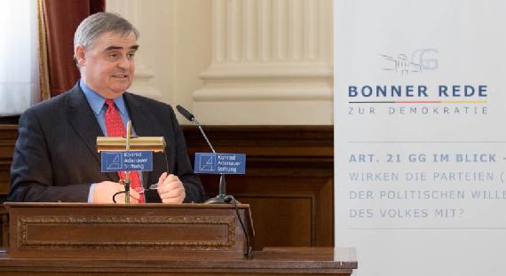 Erfahrungsgesättigt als Politiker und Ministerpräsident des Saarlandes, jetzt mit Parteienfragen im Bundesverfassungsgericht befasst, stellte Bundesverfassungsrichter Peter Müller zunächst den Parteienartikel in den Gesamtzusammenhang des Grundgesetzes und würdigte die Leistungen der Parteien bei der Weiterentwicklung der demokratischen Grundordnung. Allein dies schon hob Müllers Vortrag wohltuend von der gängigen und inzwischen wohlfeilen Parteienschelte ab.