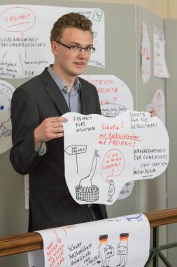 Jährlich wird man sich von nun an – angelehnt an das Jahresmotto der KAS und aktuelle Entwicklungen – einem Artikel des Grundgesetzes widmen: Dieses Jahr war es Art. 21 GG, der sich mit der Rolle der Parteien befasst. Zweihundert Teilnehmer_innen, darunter Bundestagsabgeordnete, die Vertreter Bonner Institutionen und Schülerinnen und Schüler, die eigens eine Wandzeitung zu dem Thema hergestellt hatten, fanden sich im Festsaal des Museums ein, um die Premiere der Reihe zu erleben.