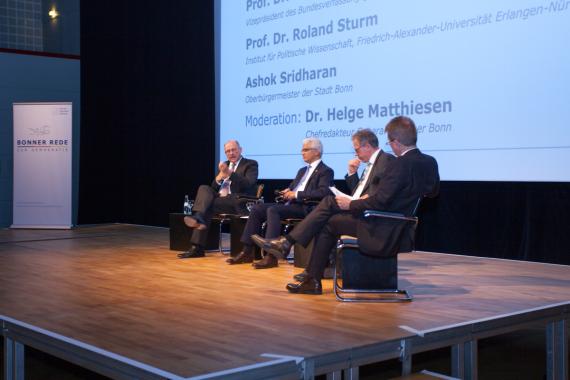 Natürlich könne man einiges verbessern, das erbrachte die anschließende Diskussion auf dem Podium, bei der Helge Matthiesen, Chefredakteur des Bonner Generalanzeigers, mit klugen Fragen versuchte, die Gesprächspartner - außer Kirchhof noch Roland Sturm, Professor für Politische Wissenschaft an der Uni Erlangen, und der Bonner OB Ashok Sridharan - aus der Reserve zu locken. Aber die Lösungen, die sie anboten, in der Inneren Sicherheit, in der Bund-Länder-Finanzfrage, waren doch eher technische Details. Gegen die Grundstimmung könne man nicht ankommen, sinnierte das Podium. Überall in Europa strebten regionale Gliederungen Staatlichkeit an; Schottland, Katalonien, Flandern sind beredte Beispiele eines regionalen Freiheitsdranges gegen den Zentralstaat. Nur in Deutschland herrsche ein lustloser „Föderalismus ohne Föderalisten“, mit Ländern, die gerne Kompetenzen abgeben, wenn sie nur an den finanziellen Tropf des Bundes kommen. Ja, will denn keiner mehr lokale Freiheit, wollen alle nur Gleichheit und gleiche Verteilung in Deutschland?, schwang sich Sturm in einem leidenschaftlichen Appell auf. In der Tat, ein Staat, der durch seine Struktur ungleiche Lebensverhältnisse ermöglicht – und Ungleichheit ist der Grundgedanke des Föderalismus – hat zur Zeit keine Lobby.
