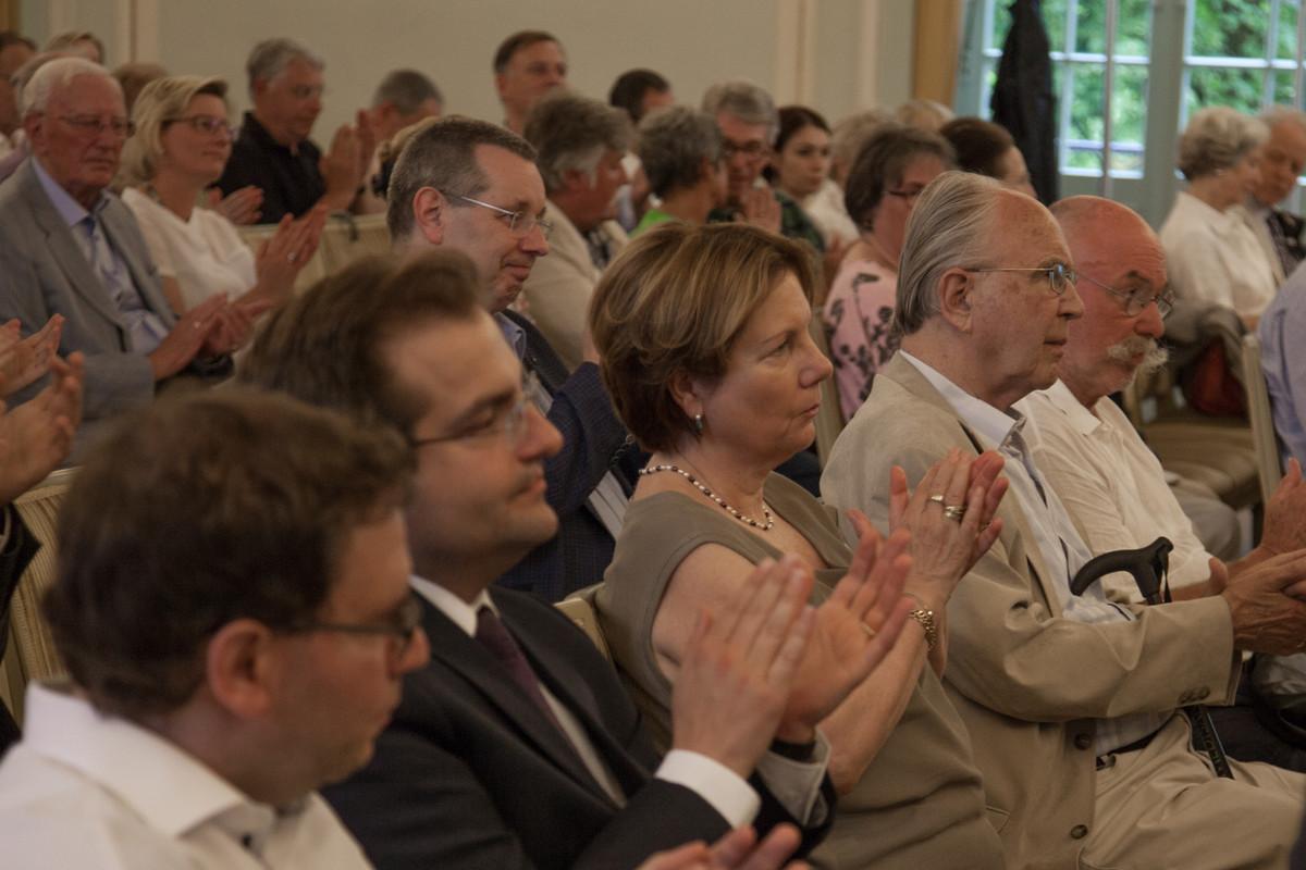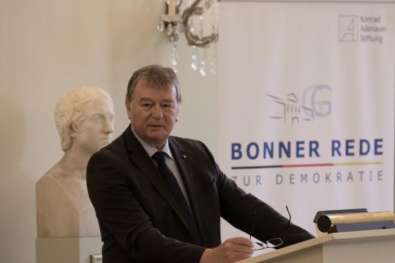 Mit Interesse erwarteten die Anwesenden schließlich die von Prof Dr. Wolfgang Löwer, Präsident der Nordrhein-Westfälischen Akademie der Wissenschaften und der Künste, gehaltene Bonner Rede zur Demokratie. Löwer, selbst ehemaliger Richter am Verfassungsgerichtshof für das Land Nordrhein-Westfalen, zeichnete zu Beginn die historischen Entwicklungslinien zum Grundsatz der Wissenschaftsfreiheit nach. Dabei würdigte er die Freiheit der Wissenschaft und der Forschung als deutschen Beitrag zur Menschenrechtskultur. Sowohl in der Paulskirchenverfassung von 1848 als auch in der Weimarer Verfassung von 1919 sei es zu einem Schutz der Universitäten und der Wissenschaft gekommen, welcher sich schlussendlich ebenso im Grundgesetz wiederfindet. Dieser Schutz impliziere gleichermaßen, dass die Wissenschaft vor Eingriffen des Staates geschützt werde und somit ihre Unabhängigkeit behaupten könne. Im Umkehrschluss heiße dies jedoch nicht, dass die Freiheit der Forschung dazu berechtige, in Drittrechtsgüter einzugreifen, fuhr Löwer fort. Dieser folgenschwere Irrtum sei während der NS-Zeit begangen worden. Die historische Entwicklung der Wissenschaftsfreiheit gleiche in der Geschichte der Bundesrepublik einem Pendelmodell: Anfangs sei das Pendel weit in Richtung der Gruppenuniversität ausgeschlagen, anschließend gegenläufig in Richtung der hierarchischen Universität. Nach einem Urteil des Bundesverfassungsgerichts und der damit einhergehenden Überprüfung der Landeshochschulgesetze sei das Pendel zur Ruhe gekommen. Zum Abschluss widmete sich Löwer dem brisanten Thema der Hochschul- und Forschungsfinanzierung. Besonders betonte er die Aufstellung wissenschaftsadäquater Verfahren bei der Vergabe projektbezogener Forschungsmittel, um ein höchstmögliches Maß an Chancengleichheit, aber auch gewissenhafter wissenschaftlicher Vorbereitung zu gewährleisten.