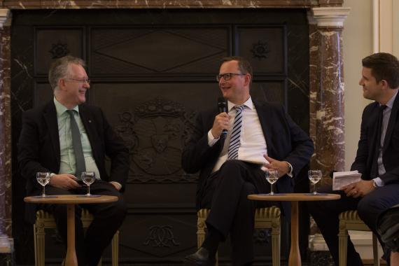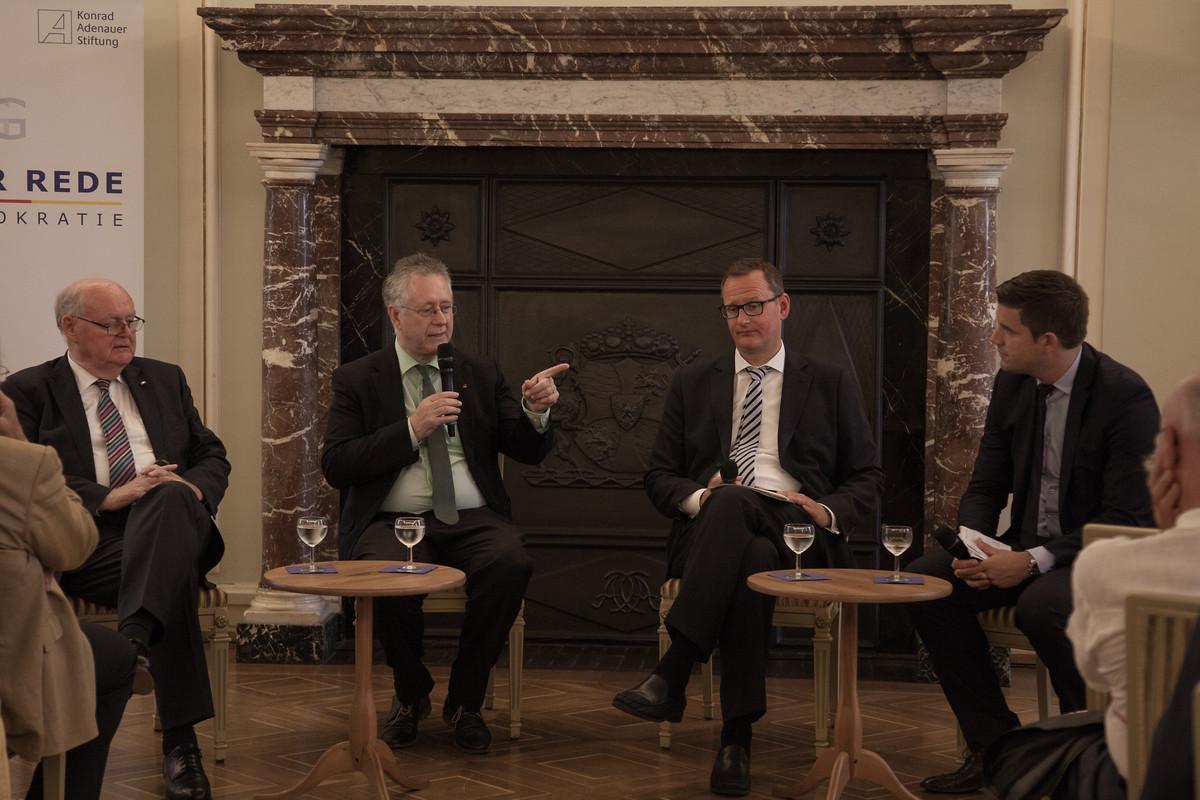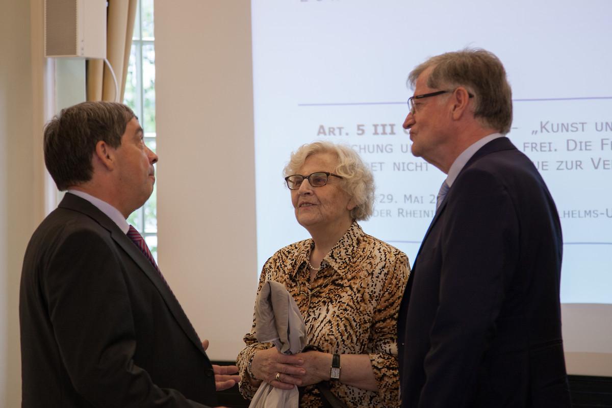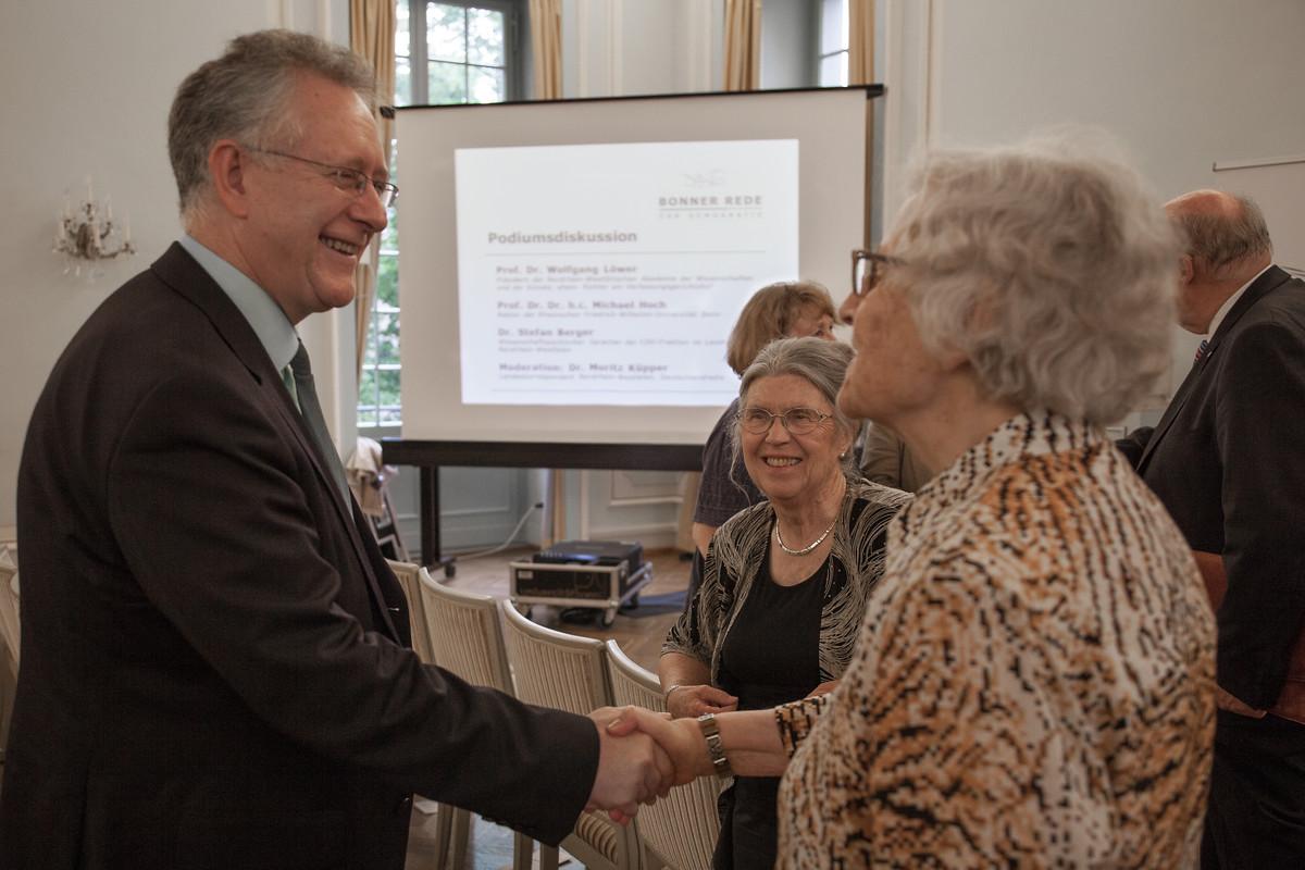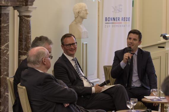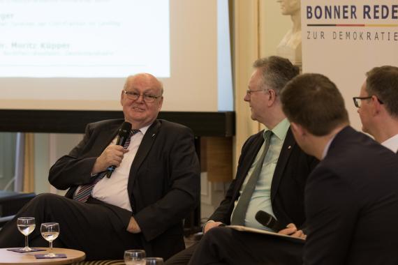 In der direkt daran anschließenden Podiumsdiskussion äußerten sich Löwer und Berger sowie Prof. Dr. Dr. h.c. Michael Hoch, Rektor der Universität Bonn, zur Verfassungs-wirklichkeit, sprich der aktuellen Situation der Wissenschaftsfreiheit. Moderiert von Dr. Moritz Küpper, NRW-Landeskorrespondent des Deutschlandradios, ging es neben der Planung auch um die Finanzierung von Hochschulbildung. In diesem Zusammenhang bezeichnet Löwer Geld als „Treibstoff des Systems“. Die Debatte um die Einführung von Studiengebühren für Nicht-EU-Ausländer sowie die selbstständige Entscheidung von Hochschulen über Bauvorhaben war in diesem Zusammenhang Thema. Ebenso setzten sich die Referenten mit den Chancen und Risiken einer stärkeren Integration der Digitalisierung in den Hochschulalltag auseinander. Hoch betonte hierbei die durch die Digitalisierung hervorgerufene Veränderung der Wissensrezeption. Ferner führte Hoch aus, dass die Bundesrepublik als Standort in Zukunft weiterhin attraktiv sei, was die Wissenschaft betreffe, da Deutschland den strategischen Vorteil eines sicheren Landes besitze.