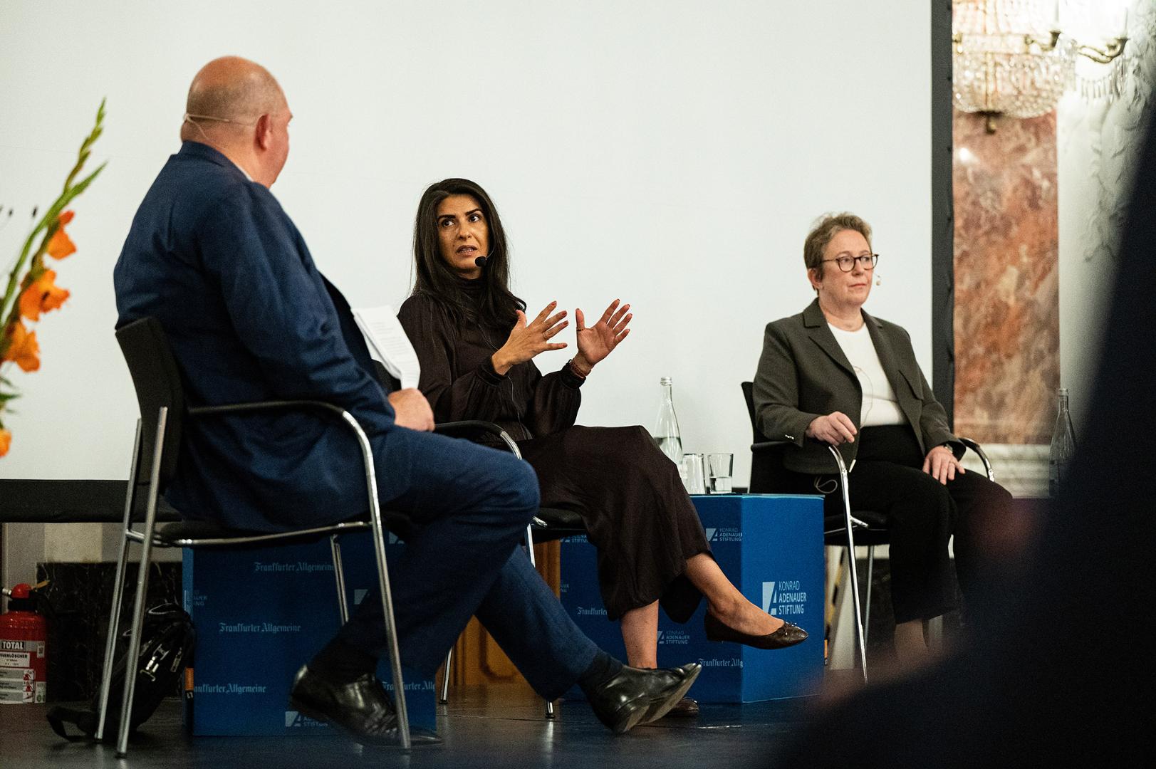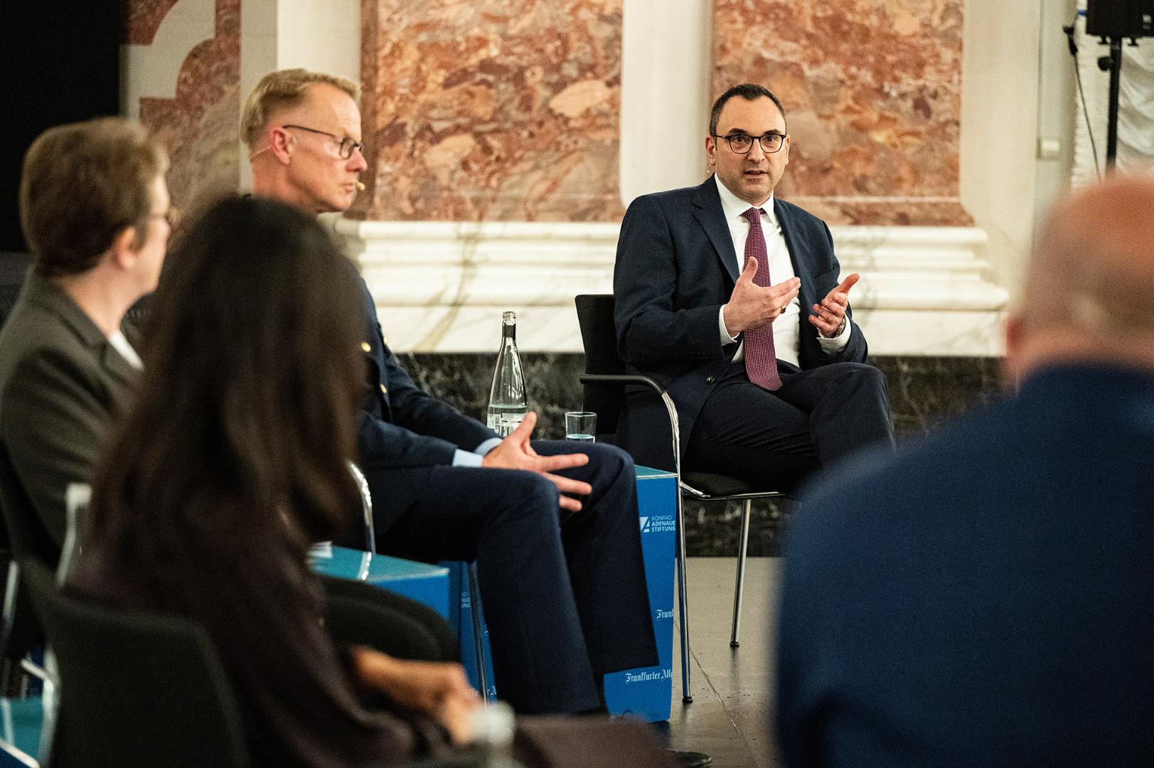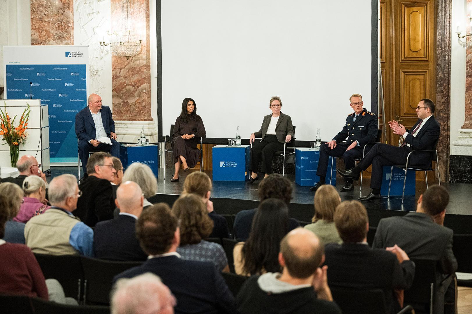 Um derlei Fragen ging es bei der diesjährigen F.A.Z.-KAS-Debatte im Rittersaal der Universität Mannheim, die von der Frankfurter Allgemeinen Zeitung (F.A.Z.) und der Konrad-Adenauer-Stiftung (KAS) organisiert wurde. Der Titel der Veranstaltung lautete: „Sicherheit in Krisenzeiten: Wie wehrhaft ist Deutschland?“. Auf dem Podium diskutierten Serap Güler, CDU-Politikerin und Mitglied im Verteidigungsausschuss des Bundestags, der F.A.Z.-Journalist Nikolas Busse, der Stellvertreter des Inspekteurs der Streitkräftebasis der Bundeswehr Generalmajor Stefan Lüth sowie Gabriele Baumann, Leiterin des Büros der Konrad-Adenauer-Stiftung in den Nordischen Ländern.