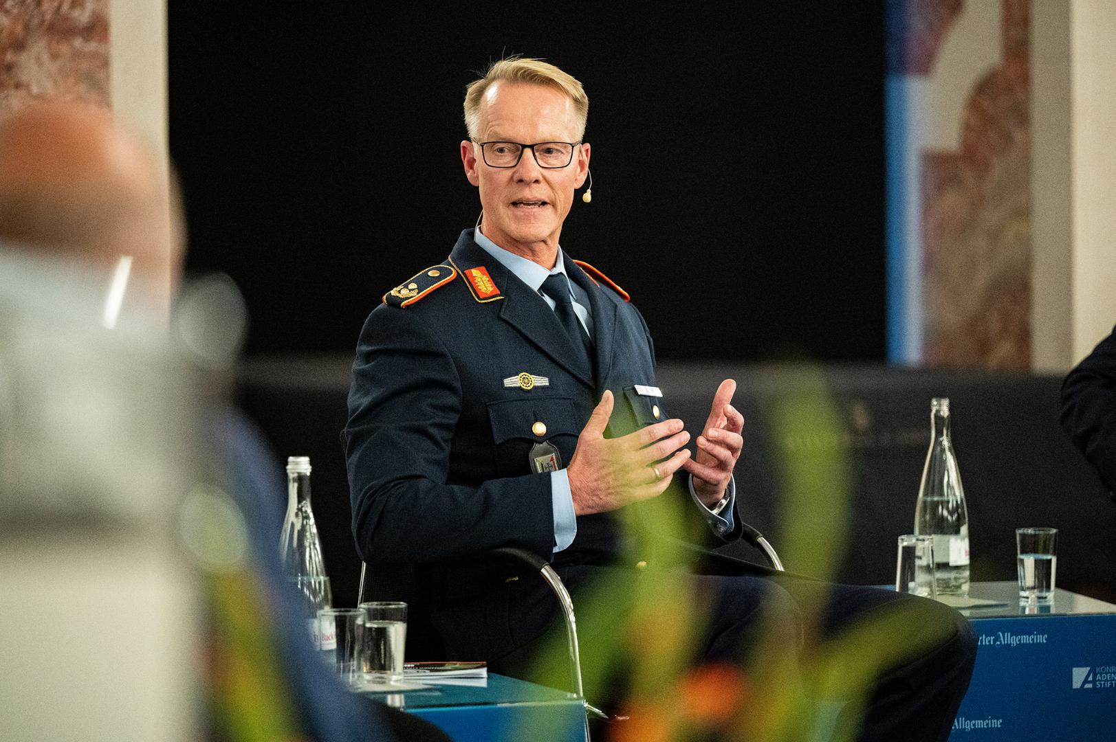 Generalmajor Stefan Lüth ging vor allem auf die Situation der Bundeswehr ein. Dabei blickte er auch auf die Personalgewinnung, die sich vor allem bei Spezialisten wie Technikern, IT-Experten und Ärzten herausfordernd gestaltet. „Das sind unsere Mangelberufe“, sagte Lüth. „Das Problem ist, dass wir mit der freien Wirtschaft um genau diese Spezialkräfte konkurrieren.“ Positiv hat sich laut Lüth indes die gesellschaftliche Wahrnehmung der Bundeswehr entwickelt, nicht zuletzt durch das Engagement in der Flüchtlings- und Coronakrise. „Der Zuspruch nimmt zu“, sagte er und berichtete von einer Begegnung in Berlin, bei der ein Vater mit seinem Sohn angehalten und ihm für seinen Dienst gedankt habe. „Das gab es vorher nie.“