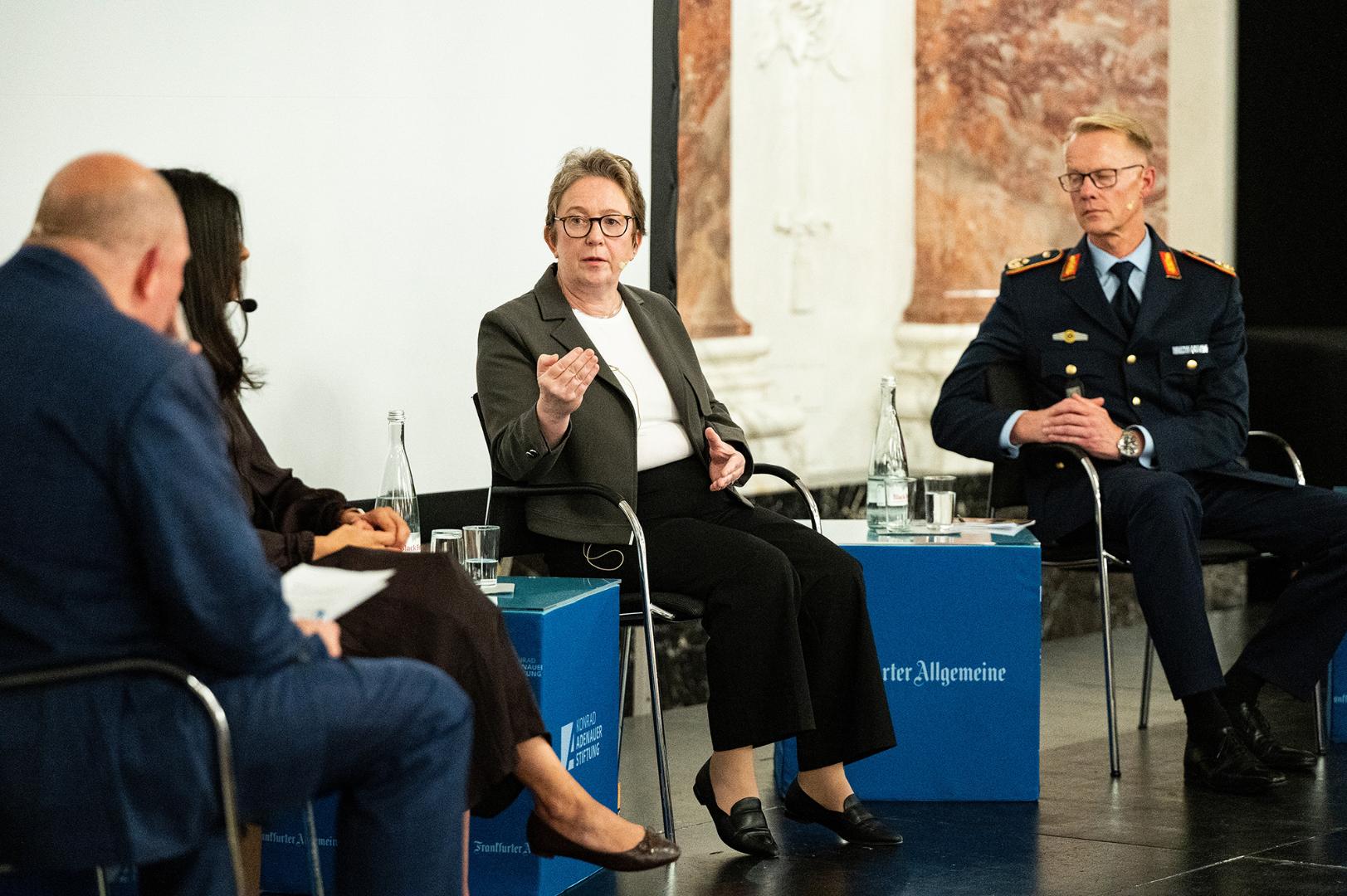 Was Staat und Bevölkerung tun können, um die gesellschaftliche Stabilität zu sichern sowie auf Krisen und Katastrophen ausreichend vorbereitet zu sein, war Thema der anschließenden Paneldiskussion, die von Jörg Thadeusz moderiert wurde. Dabei ging der Blick auch über Deutschland hinaus. So verdeutlichte Gabriele Baumann, dass die Bundesrepublik bei Fragen der Wehrhaftigkeit durchaus von befreundeten Staaten lernen kann. Die Leiterin des KAS-Büros in den Nordischen Ländern verwies auf Schweden und Finnland und deren umfassende Verteidigungskonzepte, die den Zivil- und Bevölkerungsschutz beinhalteten. Die wichtigste Säule dabei sei, dass Behörden, Unternehmen und Privatpersonen eng zusammenarbeiten. Laut Baumann werden Bewohner beispielsweise in Schweden regelmäßig darüber informiert, wie sie sich auf einen Krisenfall vorbereiten sollten, der Staat wiederum hält die wichtigsten Reserven bereit – Brennstoffe, Medizin, Getreide. Überdies habe Schweden im vergangenen Herbst den Zivilschutz durch die Einrichtung eines Ministeriums für Zivilschutz noch einmal gestärkt. „Das ist ein Konzept, das sicher auch für Deutschland interessant wäre“, sagte Baumann. Sie nannte zudem den Kampf gegen Desinformation als einen zentralen Bestandteil von gesellschaftlicher Resilienz. „Da sind die Länder im Norden ganz stark.“
