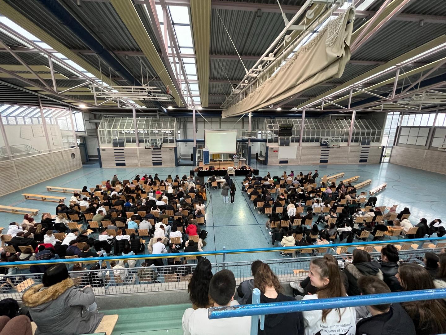Zum Abschluss ergriffen die Schülerinnen und Schüler das Mikrofon und löcherten Drotschmann mit sämtlichen Fragen, die ihnen auf der Seele brannten: Wie sieht es mit Falschmeldungen rund um den Krieg in der Ukraine aus? Und wie ist das Ganze bei der Fußballweltmeisterschaft in Katar? Wie lebt es sich eigentlich als Influencer? Und was verdient man damit eigentlich? Die Sporthalle wurde kurzerhand zum Schauplatz gepflegter Diskussionskultur, die in den sozialen Medien nur zu oft vermisst werden kann. Die Schülerinnen und Schüler freuten sich, das einmal nicht nur in Kommentarspalten ausleben zu können; Drotschmann freute sich, nicht immer nur mit einer Kamera reden zu müssen. Die Zeit für gemeinsame Fotos musste am Ende dann aber trotzdem noch sein. Als sie endlich vor Drotschmann steht, bricht aus einer Schülerin plötzlich emotional heraus: „Du hast mir schon so oft den Arsch gerettet!“