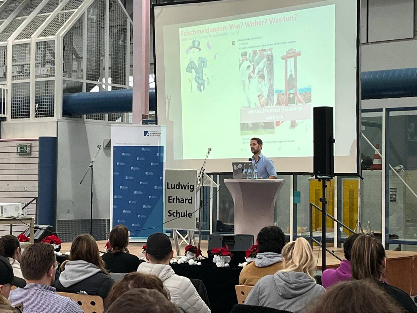 „Trau, schau, wem!“ ist das Credo von Mirko Drotschmann, als er mit rund 450 Schülerinnen und Schülern der Ludwig-Erhard-Schule in Pforzheim das Phänomen Fake News bespricht, schließlich gibt es viele Fragen zu klären: Was sind Fake News überhaupt, und warum gibt es sie? Wie erkenne ich, was eine Falschmeldung ist, und was ich glauben kann? Und wie soll ich mich eigentlich verhalten, wenn ich mit Fake News konfrontiert werde?