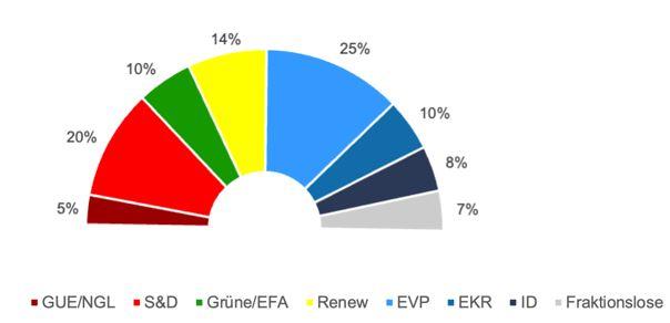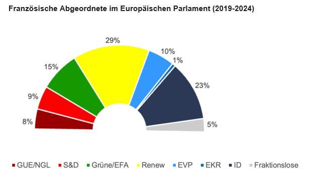 Aktuell gehören die französischen Abgeordneten mehrheitlich den Fraktionen "Renew" (Liberale, Zentristen) und Identität und Demokratie (Rechtspopulisten, Rechtsextreme) an. Diese Verteilung spiegelt die Dualität zwischen Macrons Partei "Renaissance" und dem rechtsextremen "Rassemblement national" wider.