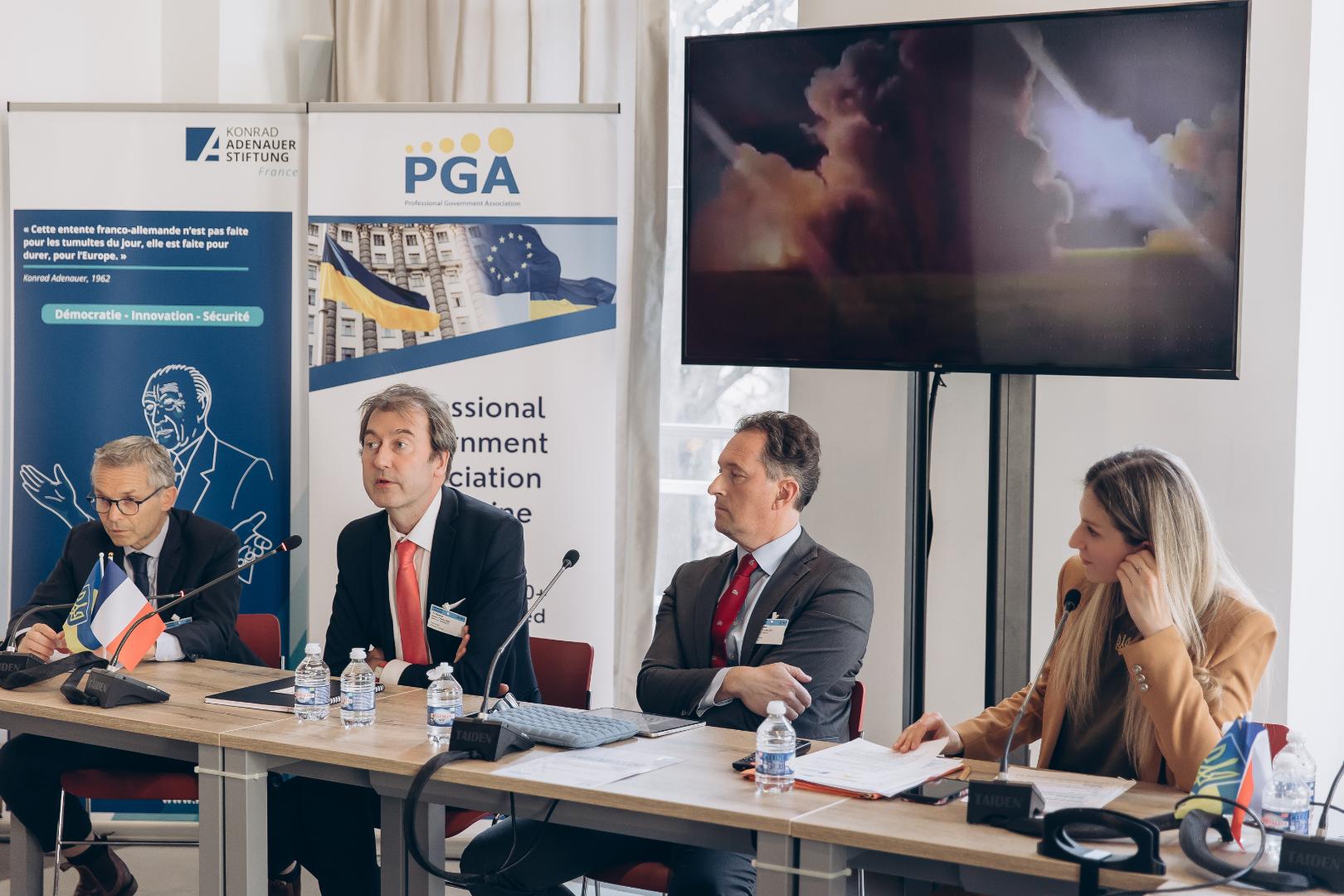 On 27 March 2025, the PGA, in cooperation with Euro Creative and with the support of the Konrad Adenauer Foundation (France), organised a conference entitled "Three years of full-scale war with Russia: how can France strengthen its support for Ukraine in the field of security and European integration? The conference explored the opportunities and obstacles for increasing French military support to Ukraine for a more secure Europe and for supporting Ukraine's integration into the EU, including through public administration reform. The two-panel event brought together leaders from the French public sector, the expert community, the private sector and other organisations working closely with Ukraine. The first panel focused on military support to Ukraine and geopolitical perspectives for Ukraine's future, while the second panel was dedicated to supporting Ukraine's reforms for European integration in the context of reconstruction, including strengthening the capacity of its public administration.