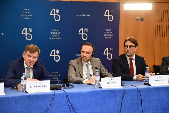 De gauche à droite : Dr. Johann Wadephul, député et vice-président du groupe parlementaire CDU/CSU au Bundestag ; Marc Hecker, directeur adjoint de l'IFRI ; Paul Maurice, secrétaire général du Comité d'études des relations franco-allemandes (Cerfa) à l'IFRI
