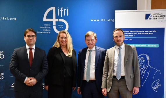 De gauche à droite : Paul Maurice, secrétaire général du Comité d'études des relations franco-allemandes (Cerfa) à l'IFRI ; Anja Czymmeck, directrice du bureau France de la Konrad-Adenauer-Stiftung, Paris ; Dr. Johann Wadephul, député et vice-président du groupe parlementaire CDU/CSU au Bundestag ; Marc Hecker, directeur adjoint de l'IFRI