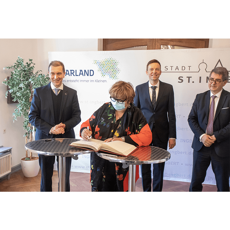 À l’issue de la rencontre, le ministre-président de Sarre, Tobias Hans, le président de la Région Grand Est, Jean Rottner, accompagné de sa vice-présidente Brigitte Torloting ont tous trois signé le livre d’or de la ville de Sankt Ingbert, en présence du maire de la ville, Ulli Meyer.
