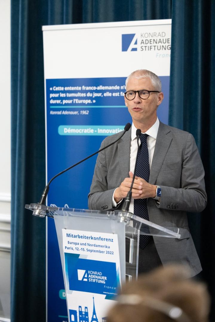 Vom 12. – 15. September fand die diesjährige MAK Europa und Nordamerika in der französischen Hauptstadt statt. In Folge der Präsidentschafts- und Parlamentswahlen der ersten Jahreshälfte 2022, sind Frankreichs politische Entscheidungsträger mit großen Herausforderungen und neuen Mehrheitsverhältnissen konfrontiert. Diese standen im Fokus des Austauschs mit Frank Riester, Minister für die Beziehungen zum Parlament, der auch auf die Rolle der Parlamente in Europa in der Zeitenwende einging. Botschafter Hans-Dieter Lucas gab in seinem politischen Briefing einen Überblick über Frankreichs innenpolitische Reformvorhaben sowie außen- und sicherheitspolitische Prioritäten.