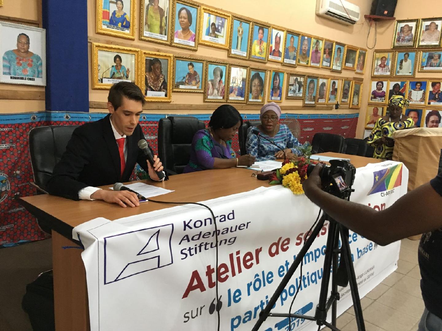 En collaboration avec le Ministère du Genre, Famille et Enfant et l’ONG locale « R2Congo » qui s’occupe de l’appui des femmes et de la jeunesse, la Fondation Konrad Adenauer (FKA) a organisé un séminaire sur le rôle des partis politiques. 40 jeunes Kinois de différents partis politiques et groupement ont participé à l’activité qui commençait avec des exposés sur la base juridique et les conditions nécessaires, à savoir le programme, l’appartenance et la registration. L’exposé de l’ancien Ministre pour la Santé et et actuel député national, Félix Kabange Numbi, a servi d’approfondir les connaissances acquises et fourni un exemple d’une carrière d’un jeune politicien. Au deuxième jour du séminaire, le député national de l’opposition, Albert Fabrice Puela, a raconté ses expériences.