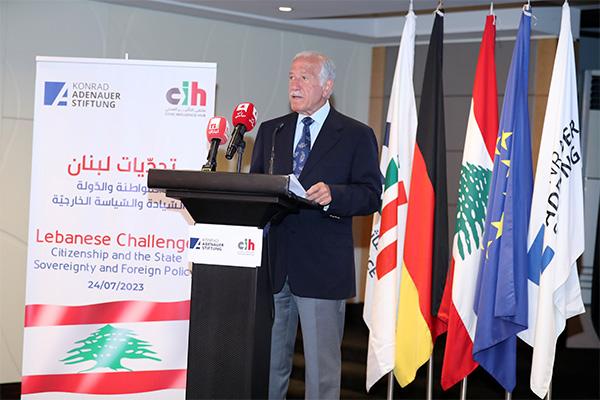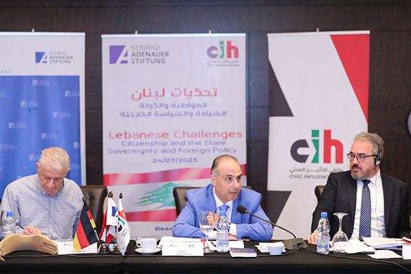 On Monday, July 24, 2022, The Konrad-Adenauer-Stiftung (KAS) and the Civic Influence Hub jointly organized a dialogue conference titled “Lebanese Challenges: Citizenship and State, Sovereignty and Foreign Policy” at the Mövenpick Hotel in Beirut. The conference served as the closing event for five Expert Focus Group Sessions conducted through a partnership between KAS and CIH under the project "Lebanon and the Policy Reform Challenges: Towards a Comprehensive Perspective." The event was attended by 50 distinguished experts, as well as diplomats and media representatives.