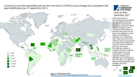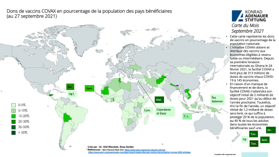 La carte de septembre illustre le nombre de dons de vaccins COVAX reçus dans les pays bénéficiaires à la fin du mois de septembre. Le dispositif COVAX, codirigé par la Coalition for Epidemic Preparedness Innovations (CEPI), Gavi et l'Organisation mondiale de la santé (OMS), vise à garantir un accès rapide, juste et équitable aux vaccins COVID-19 dans le monde entier. Depuis la première expédition internationale au Ghana le 24 février 2021, l'installation COVAX a déjà livré plus de 313 millions de doses de divers vaccins COVID-19 à 145 territoires. Toutefois, en raison du manque de dons, la facilité COVAX n'atteindra pas son objectif initial de 2 milliards de doses pour 2021 avant le début de l'année prochaine. L'objectif révisé de 1,2 milliard de doses, qui sera atteint d'ici la fin de l'année, est suffisant pour protéger près de 20% des populations respectives, soit 40% des adultes dans tous les pays bénéficiaires.