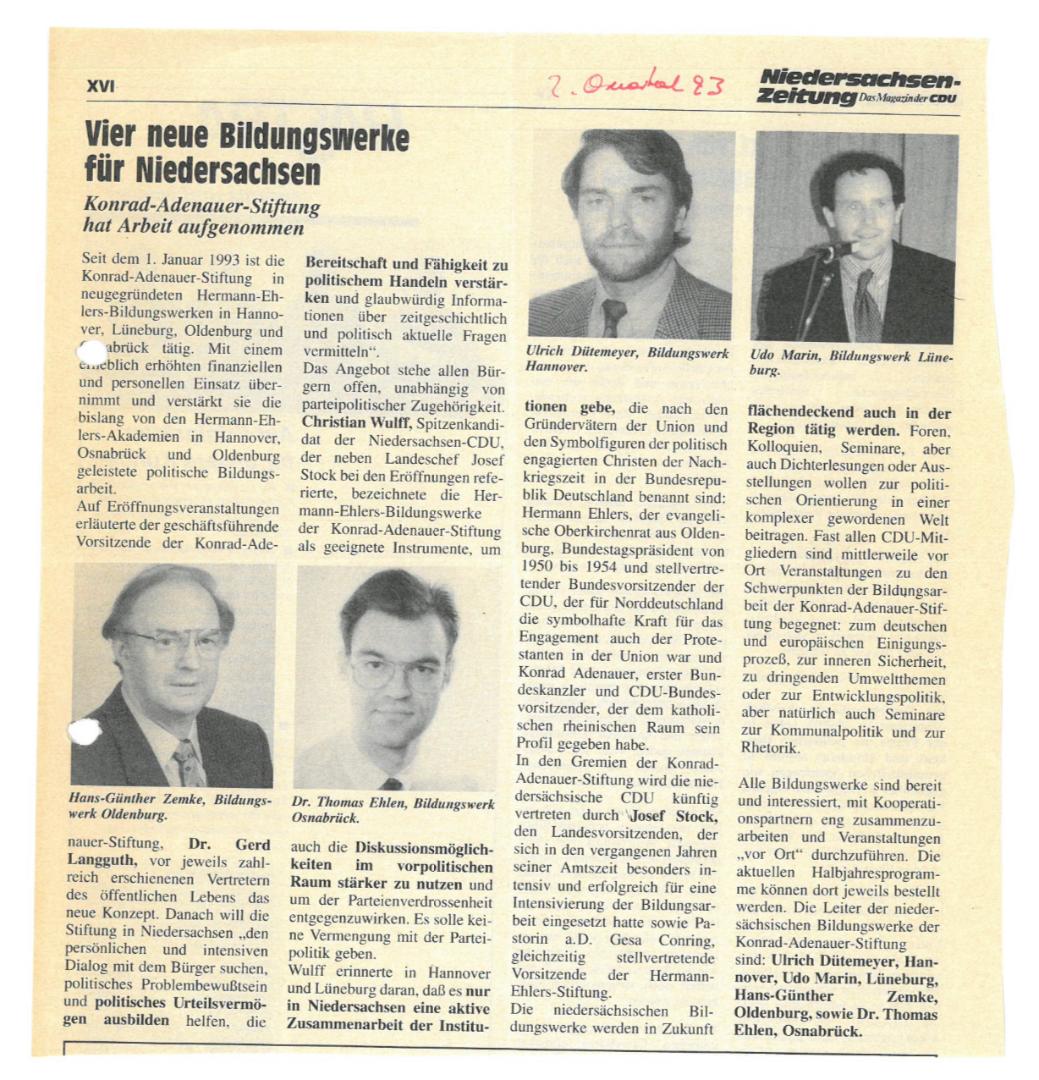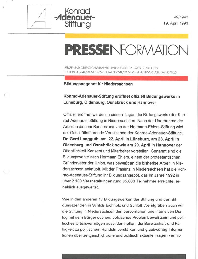 Am 29. April 1993 fand die offiziele Eröffnungsveranstaltung für den Standort Hannover statt. Neben Gerd Langguth waren der damalige Spitzenkadidat der CDU in Niedersachsen, Christian Wulff MdL, und Dr. Wolfgang Scheel, 1. Bürgermeister Stadt Hannover, Hauptredner. Erster Leiter in Hannover wurde Ulrich Dütemeyer, vormals Geschäftsführer der Hermann-Ehlers Akadmie in Hannover, aus der die KAS in Niedersachsen hervorgegangen ist.
