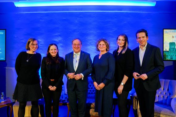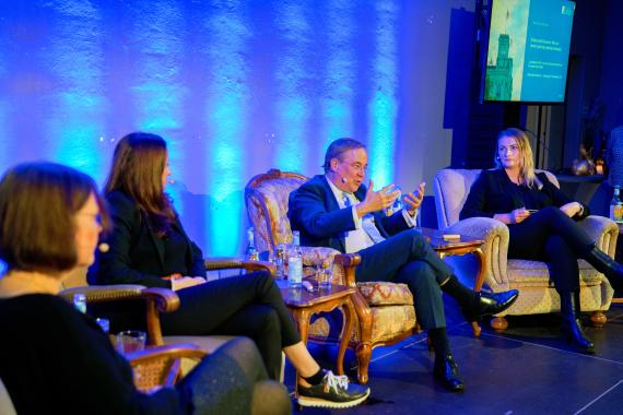 In seinem Eingangsimpuls schlug Laschet die Brücke von der Vergangenheit in die Gegenwart: Er begann mit einem Rückblick auf die hoffnungsvolle Zeit der frühen 1990er Jahre nach dem Fall der Berliner Mauer. „Wir dachten damals, eine friedliche Ära liege vor uns“. 35 Jahre später sieht sich die Welt jedoch mit alten und neuen Konflikten konfrontiert: Ein Krieg in Europa, mit Schützengräben wie im Ersten Weltkrieg und zunehmender gesellschaftlicher Antisemitismus. „Alles muss in jeder Generation neu vermittelt und gelernt werden“, sagte Laschet und mahnte, dass die Geschichten der Vergangenheit lebendig gehalten werden müssten.
