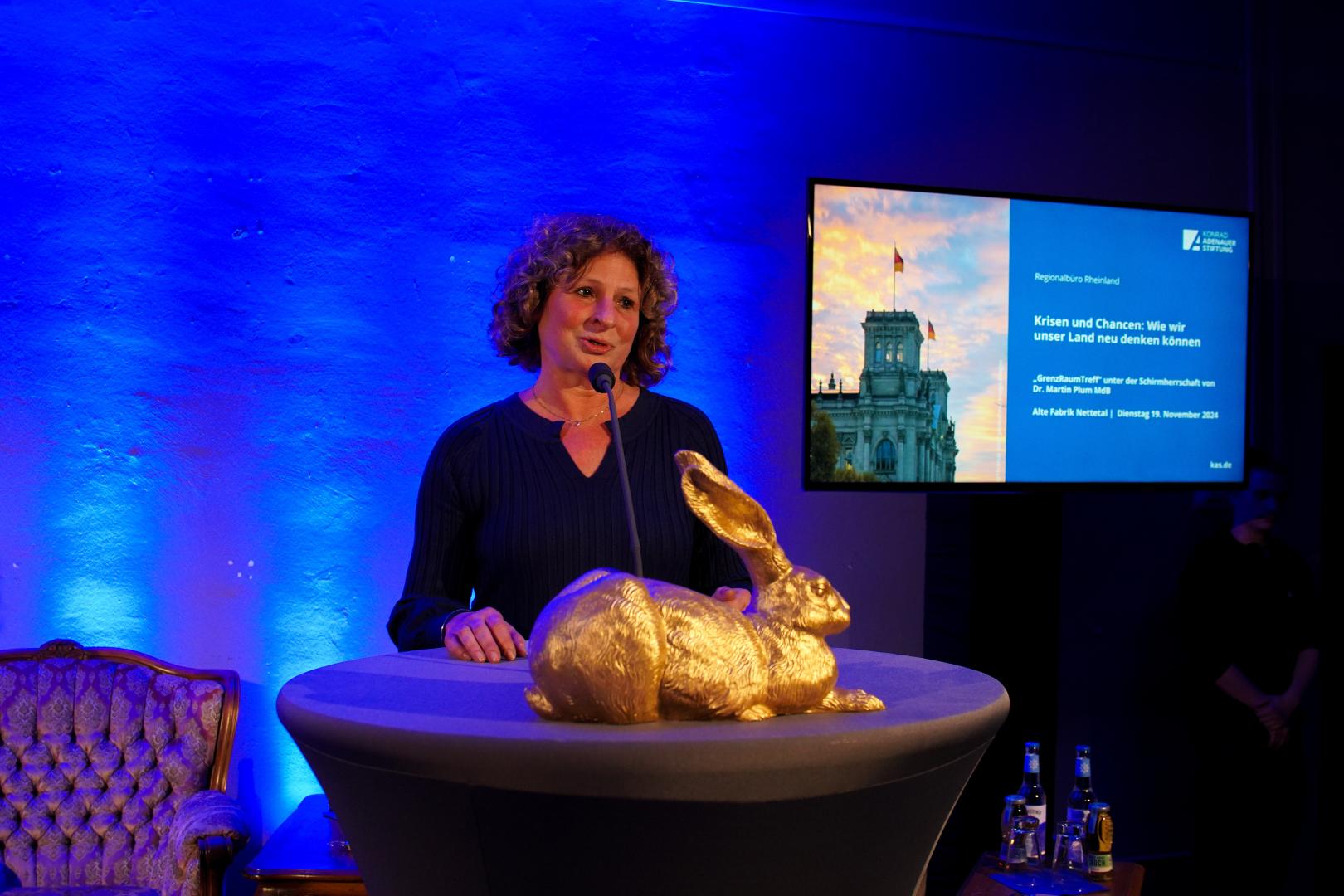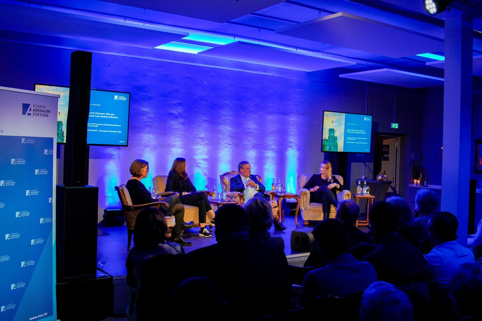 Auch die Rolle der Wirtschaft wurde von Seiten des Publikums thematisiert. Die Journalistin und Podcasterin Angela Krumpen sagte darauf, dass wirtschaftliche Unsicherheit oft zu gesellschaftlicher Unzufriedenheit führe: „Wir brauchen deshalb eine handlungsfähige Regierung, die Planbarkeit vermittelt und den Menschen ein Gefühl von Orientierung gibt“, sagte Krumpen.