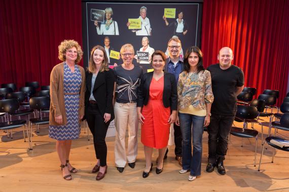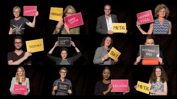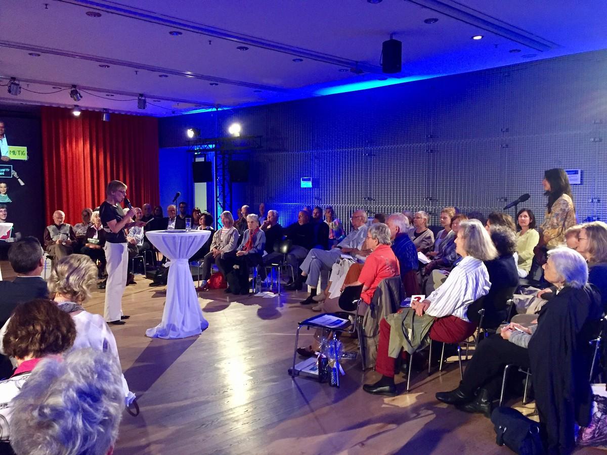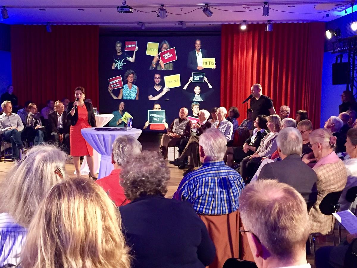Doch bereits im Vorfeld konnte jeder Gast mitmachen: Aus Schildern, bedruckt mit Schlagworten wie „weltoffen“, „solidarisch“, „mutig“ oder „bunt“, suchte sich jeder Besucher das aus, das seine Vorstellung zur idealen Gesellschaft am besten widerspiegelt und hielt es in eine Kamera. Die Fotos liefen während der Diskussion auf einer Leinwand im Hintergrund.