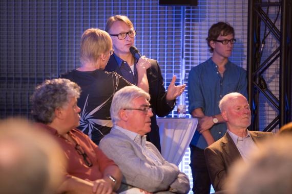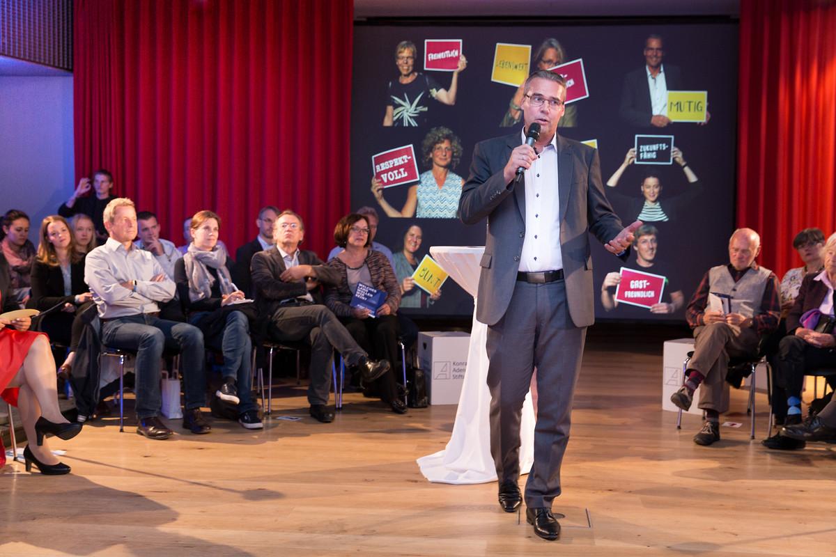 Die Zukunftsangst, vor allem der jungen Generation, sprach Yasmin Honnef, Studentin der Politikwissenschaften in ihrem Impuls an. Aber die Haltung „nein, das schaffen wir nicht“, könne sich die Gesellschaft erst Recht nicht leisten. Stattdessen müsse sie begreifen, dass Demokratie ein Lernprozess sei und ein Zustand, den man sich erarbeiten müsse. „Was sind wir denn bereit, für unsere freiheitliche Grundordnung zu tun?“, fragte Alexander Carius, Direktor von adelphi und Mit-Gründer von „Die Offene Gesellschaft“ im Anschluss. „Einen demokratischen Diskurs einleiten und weiterführen, auch wenn es wehtut“, mahnte er. Und ganz konkret? „Helfen, statt verwalten“, „freundlich miteinander umgehen“, „mehr Engagement voneinander fordern“ waren die Antworten aus dem Publikum.