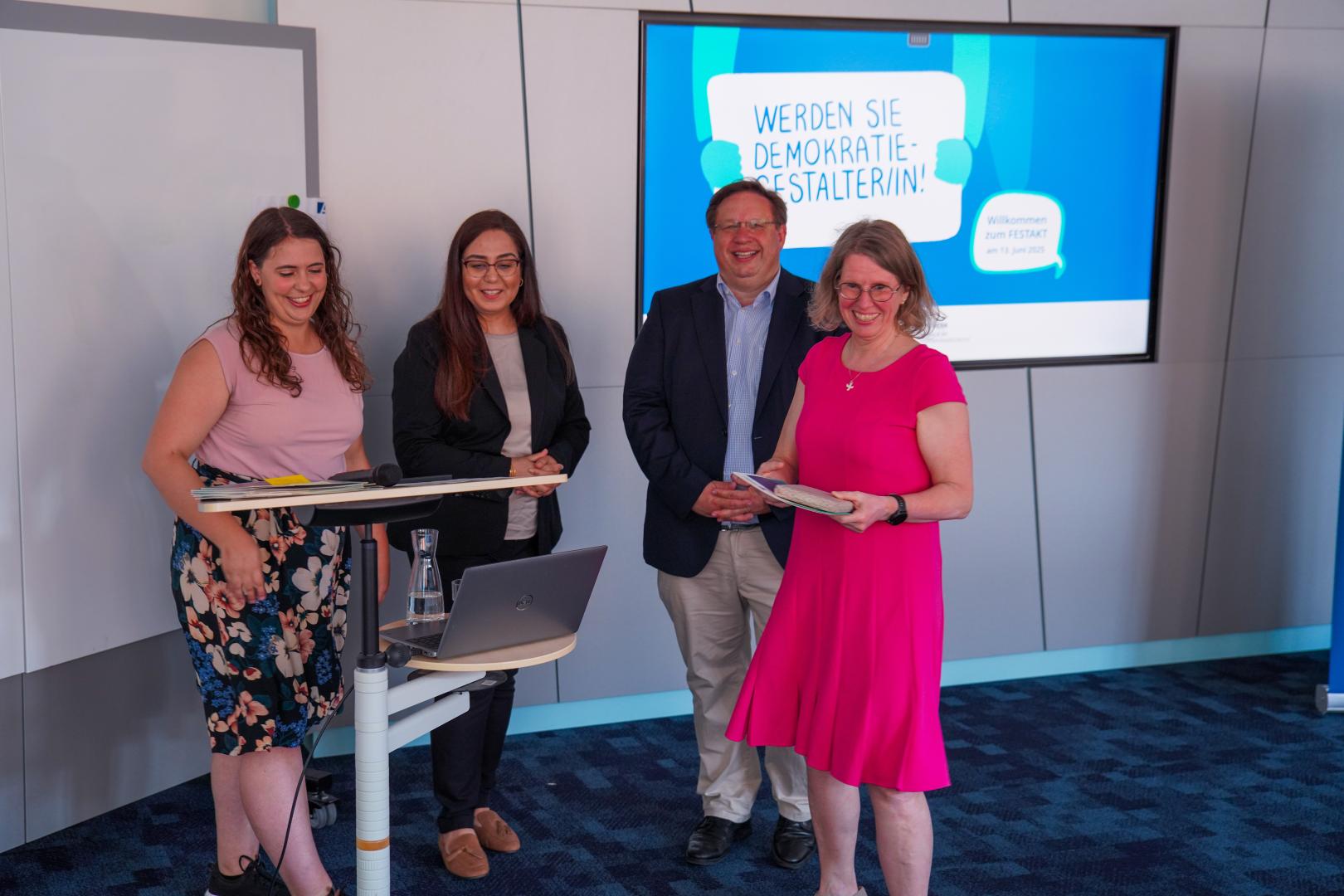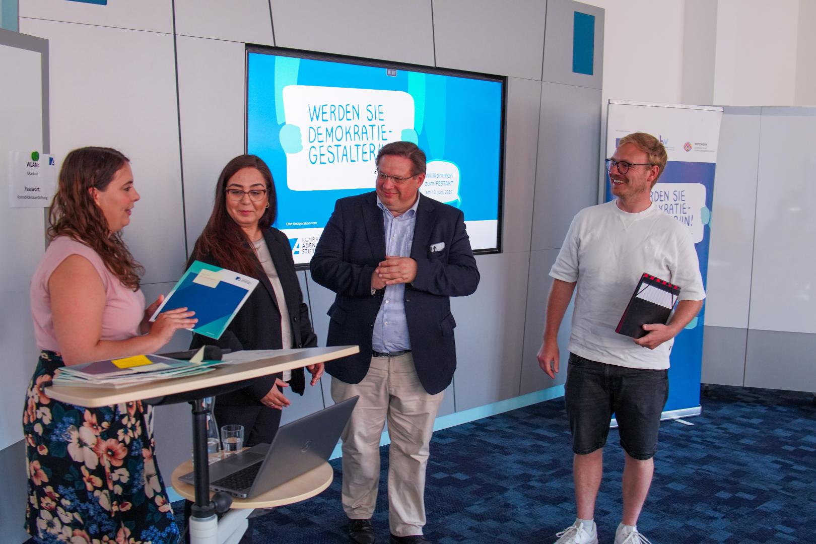 Die Teilnehmenden durchliefen über rund ein Jahr hinweg vier Module, die von Moderatorin Angelina Gutierrez im Rahmen der Veranstaltung dem Publikum vorgestellt wurden. Inhalte wie die Rolle von Schule im demokratischen System, der Umgang mit Vielfalt und Diskriminierung an Schulen und die Entwicklung einer auf demokratischen Werten basierte Haltung standen dabei im Fokus.