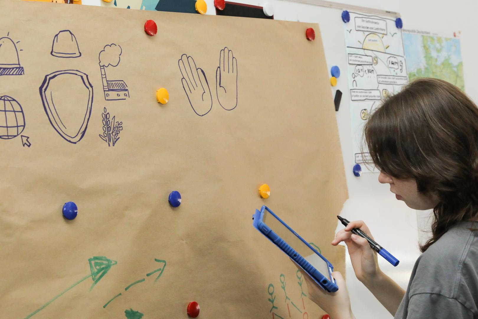 In einer Abschlussrunde stellten die Schülerinnen und Schüler im Plenum ihre Ergebnisse und Erkenntnisse aus den einzelnen Workshops vor – die Zeit, genau zwei Minuten, ein Graphic Recording zum Thema wird live vollendet.