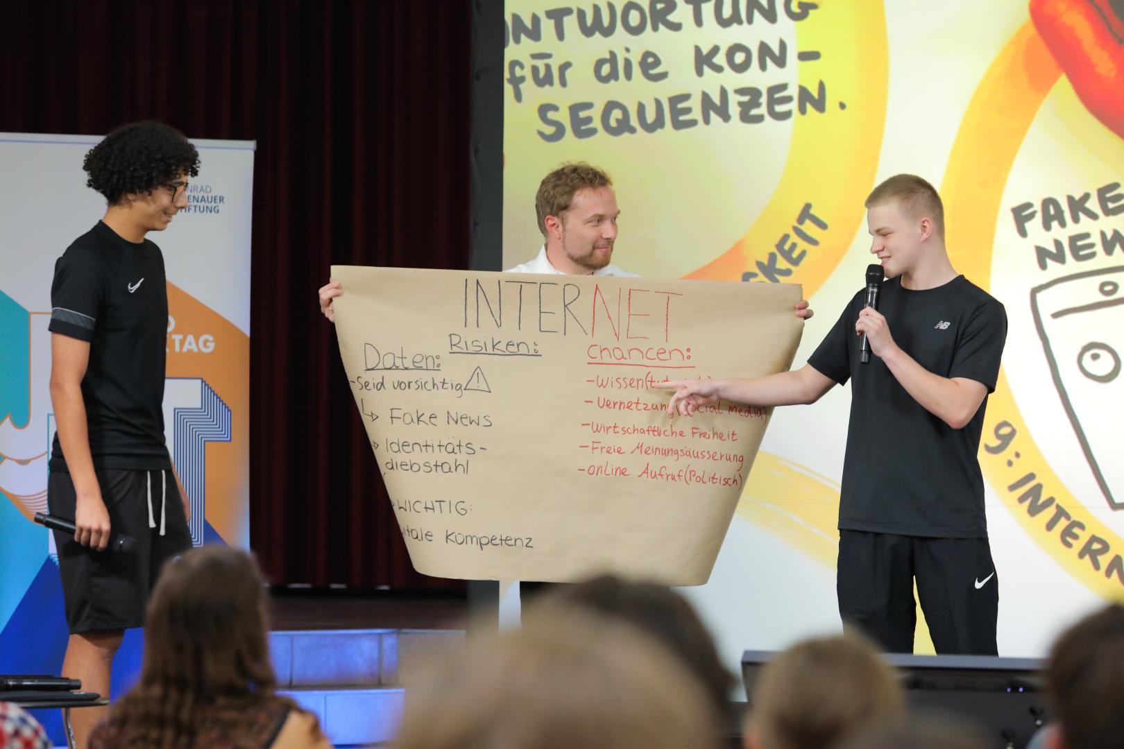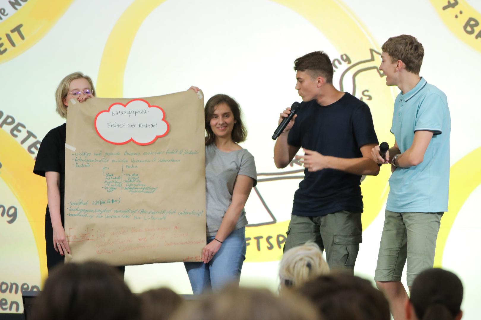 Unter diesem Thema führten die Schülerinnen und Schüler eine Diskussion mit dem Podium – Mitdiskutanten hier: Miedya Mahmod, Marius Jung, Marie-Sophie Lang, Expertin für Recht und Politik sowie der Sicherheitsexperte und Dr. Justus Bobke, Sicherheitsexperte. Die Moderatorin Sandra Wahle schaffte es durch aktuelle politische Bezüge, so beispielsweise zu einer Erklärung des Elternrats zur Schulkleidung, eine rege Diskussion mit den Schülerinnen und Schülern zu entfachen. Eine Schülerin äußerte: "Kleidung ist für mich ein Symbol der Alltagsfreiheit, durch sie kann ich meine Identität zum Ausdruck bringen."