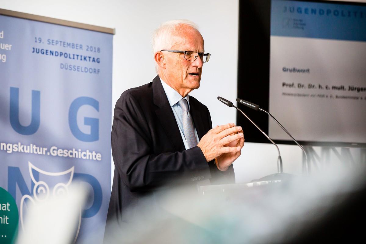 Als nächstes wendet sich mit einem Grußwort der Schirmherr der Veranstaltung, Prof. Jürgen Rüttgers, an die Jugendlichen. Er ermutigt die Schüler, sich einzusetzen und erzählt vom Fall des Eisernen Vorhanges, den er als Abgeordneter mitbekam: Diese Erinnerungen haben bis heute Einfluss auf sein Handeln.