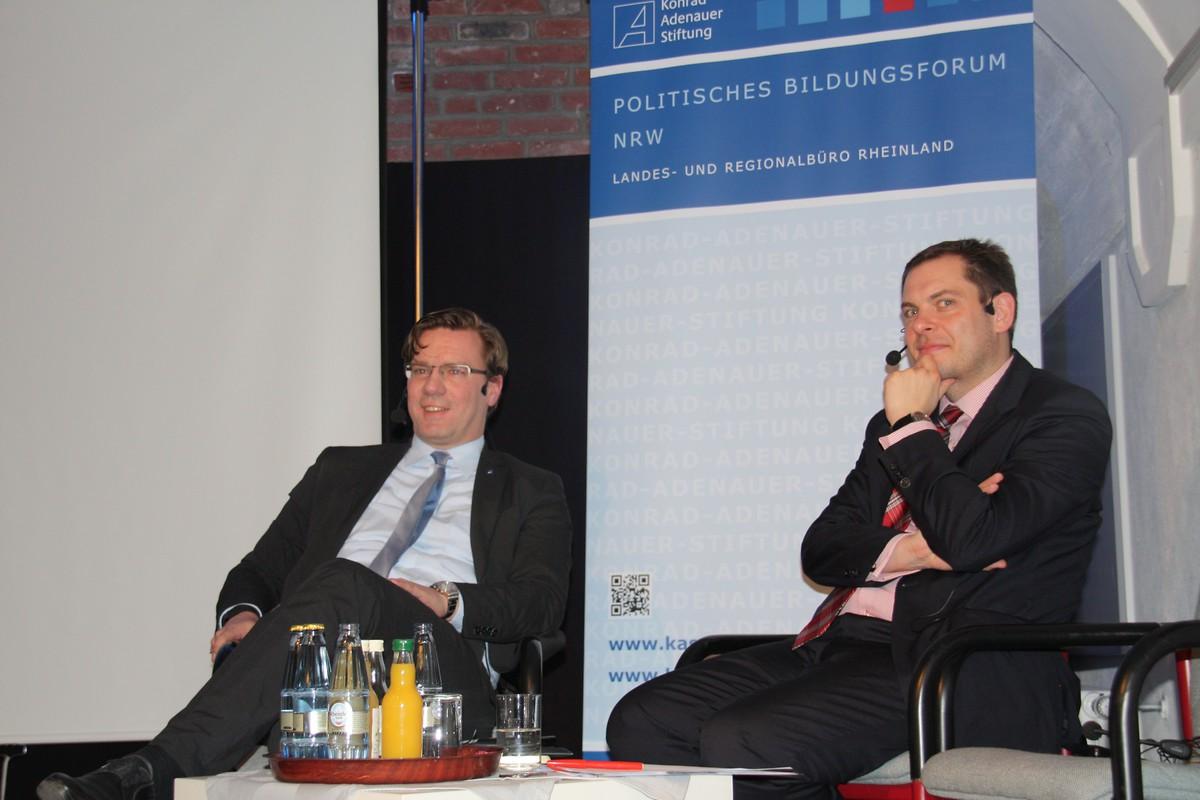 Im Zentrum der Veranstaltung stand zu Beginn die grundlegende Auseinandersetzung mit der Bedeutung und Funktionsweise rechtspopulistischer Bewegungen für Parteien und Demokratie. Ausgehend von der von Ansgar Heveling formulierten Frage „Wer geht für die Pegida auf die Straße und warum?“ schaffte es Nico Lange den Zuschauern aus Sicht des Politikberaters nachvollziehbar und verständlich Antworten auf diese Fragen zu geben. Besonders die einfachen, zugespitzten und aussagekräftigen Statements populistischer Bewegungen nannte er als Grund für den großen Zulauf, welchen Pegida und AfD in den vergangenen Monaten erfahren hätten. Wenig ausdifferenziert, lösungsorientiert und ohne programmatische Präzision stellen populistische Bewegungen und Parteien eine ideale Projektionsfläche für die eigene Position dar und werden so zum Sammelbecken ganz unterschiedlicher Einstellungen und Positionen, so der Referent. Darüber hinaus verstärken würde die Zunahme diffuser Abstiegsängste sowie die Veränderung des Wahlverhaltens in einer zunehmend individualisierten Gesellschaft, welche etwa eine Abkehr von der klassischen Stammwählerschaft bedeutet, den Zulauf zu populistischen Bewegungen und das Aufkommen neuer Parteien verstärken.