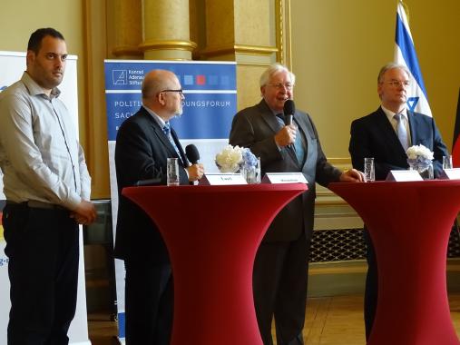 Die Festrede hielt Prof. Dr. Bernhard Vogel, Ehrenvorsitzender der Konrad-Adenauer-Stiftung e.V. und Ministerpräsident a.D. von Rheinland-Pfalz und des Freistaats Thüringen. Prof. Vogel erinnerte an Staatsgründung Israels vor 70 Jahren, als David Ben-Gurion am 14. Mai 1948 die Unabhängigkeitserklärung verlas und damit den modernen Staat Israel proklamierte – dies nur wenige Jahre nach Ende des Zweiten Weltkrieges und der nationalsozialistischen Gewaltherrschaft. Die Nationalsozialisten hatten das Ziel verfolgt, das jüdische Volk auszulöschen – dem Terror und Massenmord im Holocaust fielen sechs Millionen Menschen zum Opfer. Unmittelbar nach der Unabhängigkeitserklärung war Israel erneut bedroht, als eine Allianz von sechs arabischen Staaten noch in der Nacht den neu gegründeten Staat angriff. Seither musste sich Israel mehrmals gegen militärische Attacken und Terroranschläge behaupten und sieht sich auch bis zur Gegenwart durch seine Feinde gefährdet.