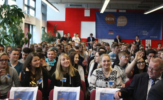 Das Wirtschaftswachstum ist auch damit verbunden, wie viele Fachkräfte auf dem Markt sind, betonte der Ministerpräsident. „Das hängt von euch ab“, wandte er sich dabei an die jungen Menschen. Er verwies auch darauf, dass viele Unternehmen ihre Auftragsbücher limitieren müssten, denn oft können sie keine zusätzlichen Aufträge mehr annehmen. Um so wichtiger sind Eigeninitiative und persönliches Engagement. Das Land bietet hierfür die besten Rahmenbedingungen, u.a. Förderprogramme für Menschen, die den Schritt in die Selbstständigkeit wagen. Für diesen Schritt sind stets neue Ideen notwendig und gesucht! Zudem sei die geografische Lage Sachsen-Anhalts ideal, wie Dr. Haseloff am Beispiel der Automobilindustrie darstellte: Viele Zuliefer-Firmen siedeln sich im Bundesland an, da Sachsen-Anhalt zentral in Europa liegt und somit ideale logistische Voraussetzungen erfüllt.